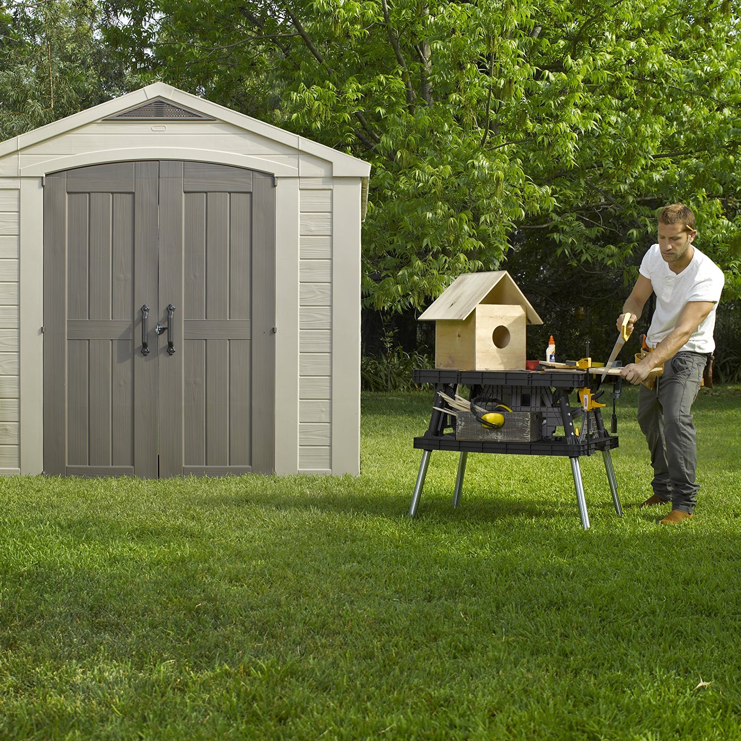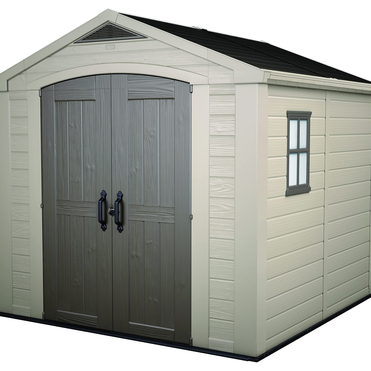 Keter Factor 8x8 Foot Large Resin Outdoor Shed with Floor for Patio Furniture, Lawn Mower, and Bike Storage, Taupe & Brown