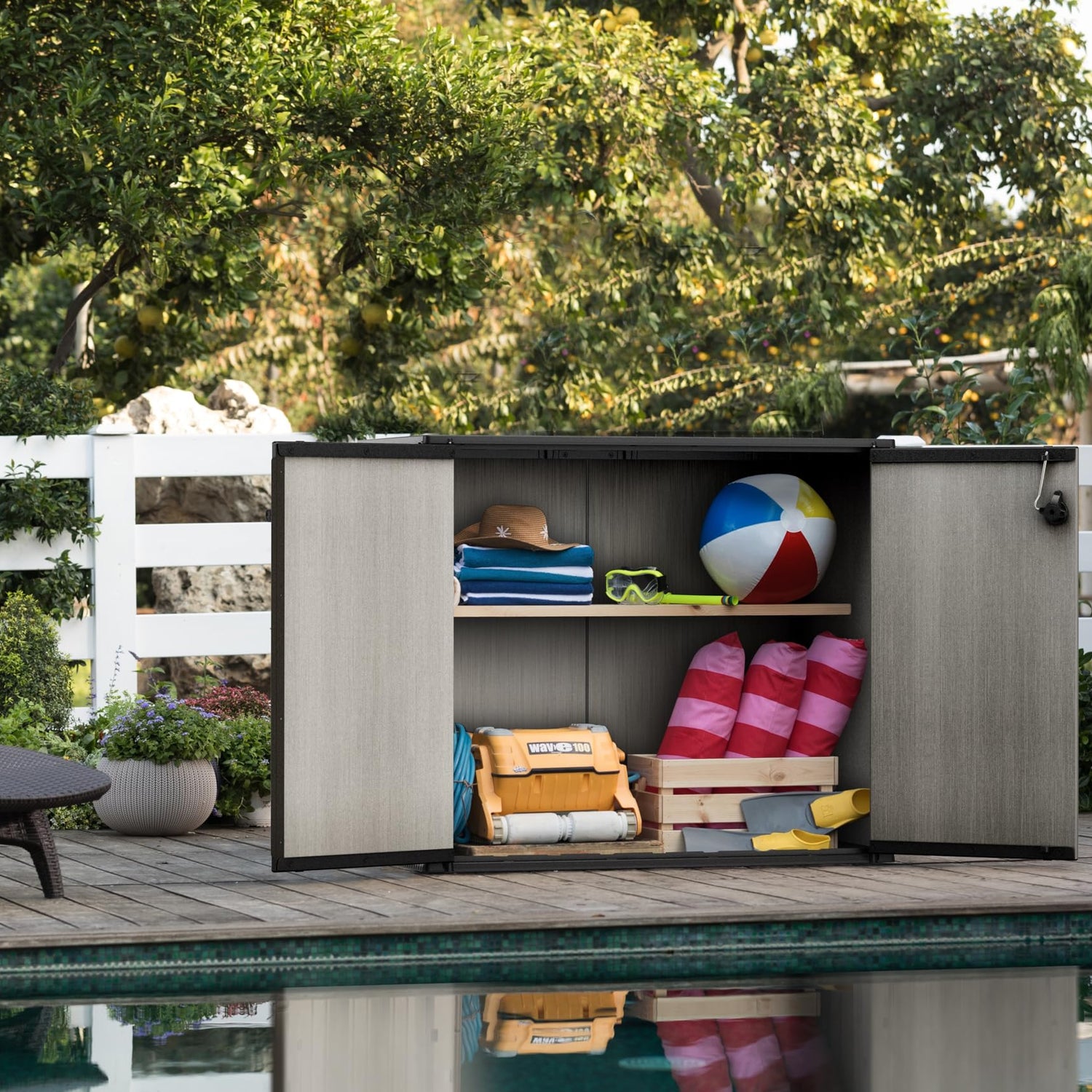 Details: The Keter Patio-Store Horizontal Storage Shed brings all the elegance of rustic wood texture to a perfect marriage of function, design, and versatility. Don’t let its pretty façade fool you. This horizontal shed aims to please with its long list of added features and benefits. The Patio-Store shed features unique polypropylene plastic DUOTECH double wall panels that mimic the look of rough-hewn wood. Its sloped threshold enables even the heaviest garden tools to be rolled in and out with ease. It is paintable to whatever color you prefer and comes with two adjustable brackets to support an extra shelf if needed. Versatile storage has never been so customizable!