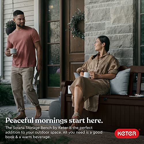 Keter Solana 70 Gallon Storage Bench Deck Box for Patio Furniture, Front Porch Decor and Outdoor Seating – Perfect to Store Garden Tools and Pool Toys, Brown/Brown