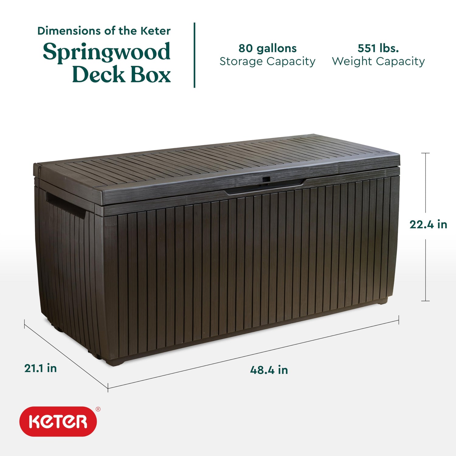 Details: If you like classic and functional outdoor storage solutions for your patio or deck, you need to look no further than the Keter Springwood deck box. With the Springwood you will have a practical and attractive deck box. The Springwood will blend in with any décor in your yard and provides you with storage and seating for two. You'll enjoy these features and benefits when you choose this plastic deck box for your outdoor area: 80-gallon capacity External dimensions: 48. 4 L x 21. 2 W x 22. 4 H inches Internal dimensions: Constructed out of polypropylene resin Doubles as a comfortable seat for two Built-in handles and rollers for easy moving Lockable for added security (lock not included) Easy to assemble No maintenance required Will not warp, dent, rust or peel Never needs painting Weather-resistant, waterproof and UV protected
