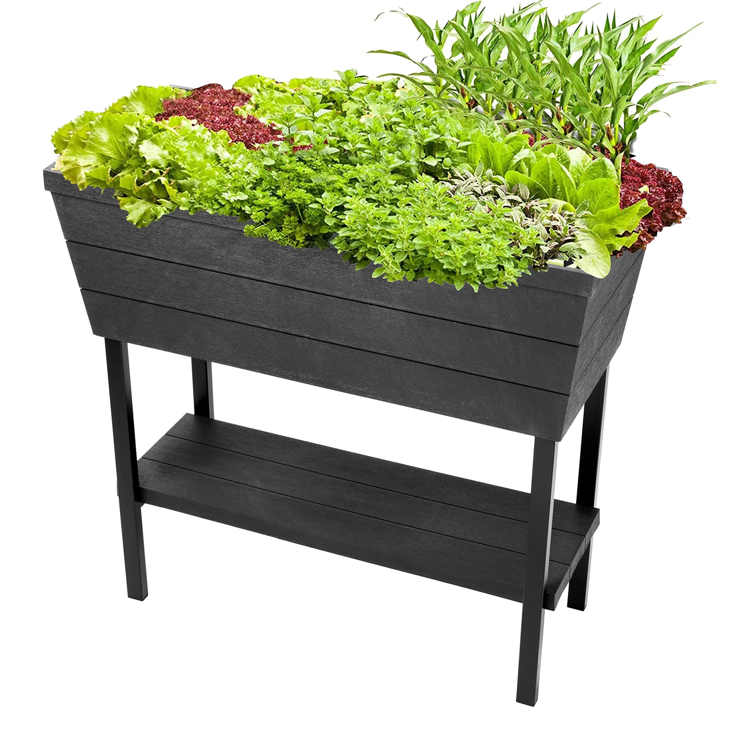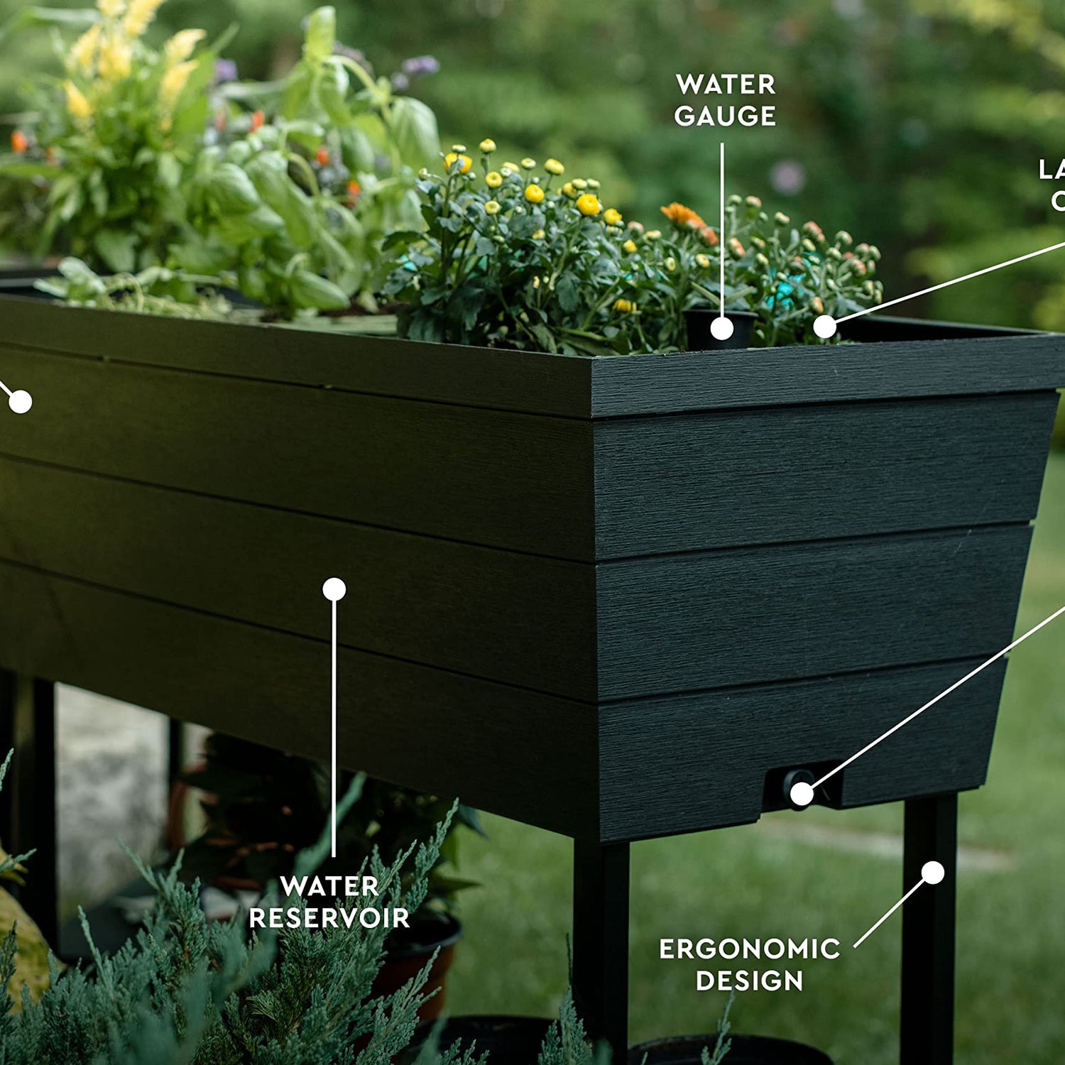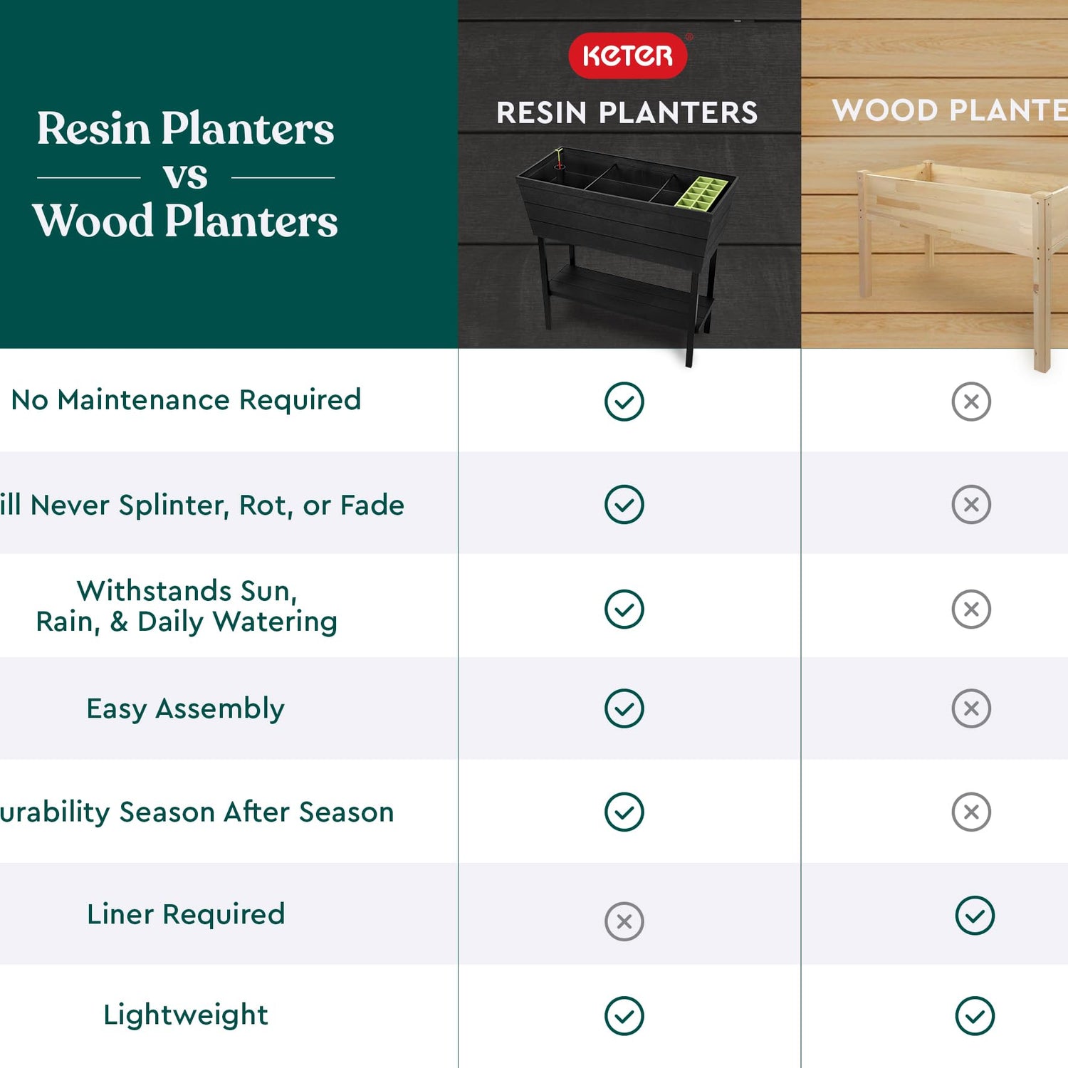 Details: Take your gardening efforts to the next level with the Urban Bloomer elevated garden bed from Keter. You don't need a house in the country to enjoy farm-fresh produce and herbs. Whether you want to become more self-sufficient, reduce grocery costs or just savor the flavor of freshly picked fruits and veggies, our planter offers easy access to nature's bounty in suburban or urban settings. The planter is designed to be an attractive addition to your outdoor decor. Large enough to accommodate 12. 7 gallons of soil for growing your favorite juice or smoothie ingredients, it's also compact enough to fit comfortably with your patio furniture and grill. Its smooth lines add a modern touch to your outdoor living space, and its wood-look exterior blends beautifully with most patio furniture. Heavy-duty resin construction means no rusting or rotting, and the UV protected material prevents fading, even after years of sun exposure. The container also works well as an elevated flower box planter. Enjoy these additional benefits from our raised bed: Dimensions: 32. 3 in. L x 14. 7 in. W x 30. 7 in. H 12. 7 gallon soil capacity Simple garden maintenance Attractive design Encourages healthful eating Perfect for apartment and condo living Included seed starting tray Great for gardeners of all ages Teaches kids how their food is grown Self-watering system and drainage tap for hassle-free hydration