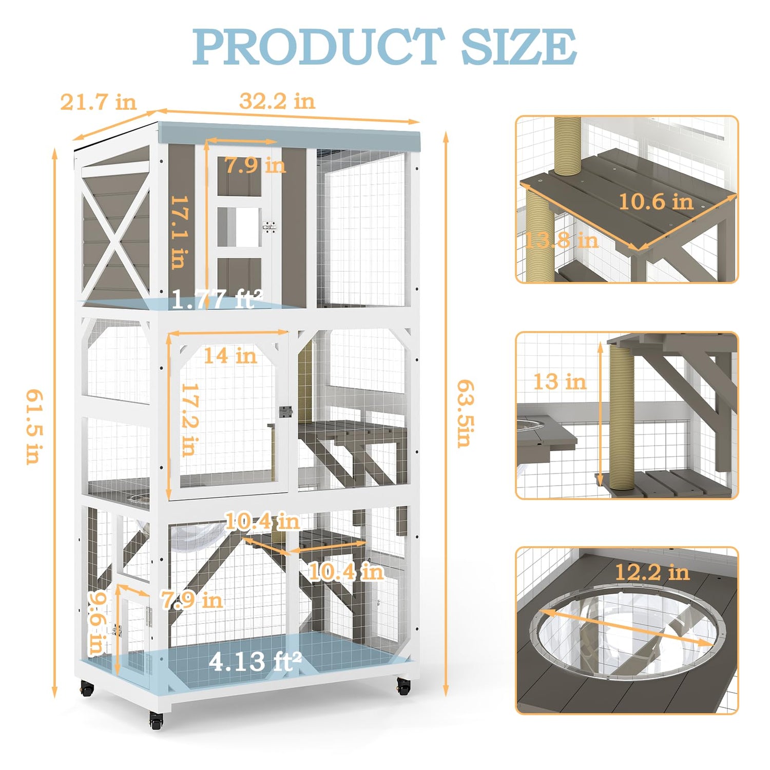 Ketive 64" Large Wooden Catio Outdoor Cat Enclosure, Window Cat House with Wheels & 3 Platforms, Kitty Cage with Weatherproof Roof for Multiple Cats (Gray)