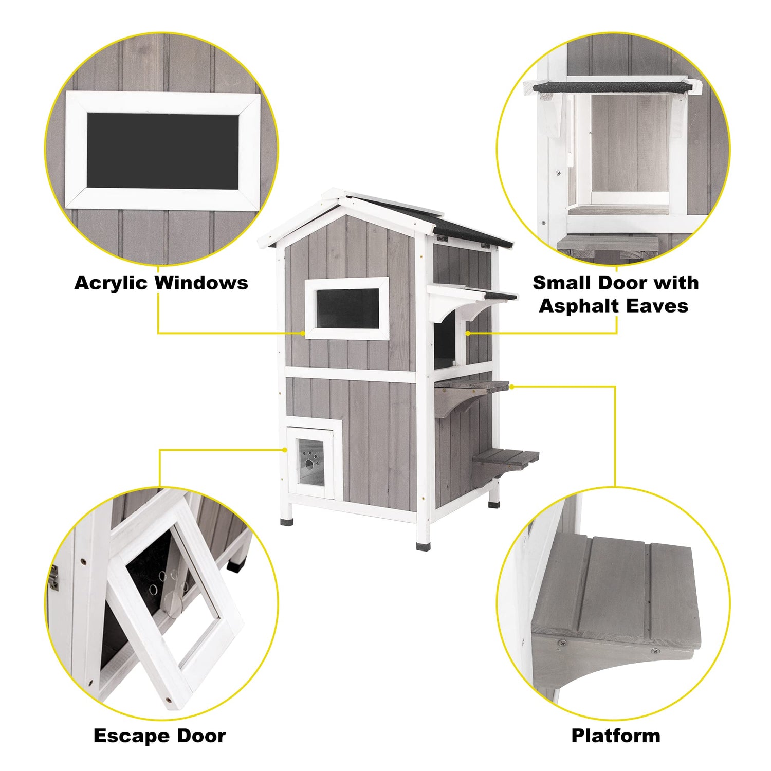 - 【Keep Warm and Dry】Raised sub-floor and plastic feet can survive heavy rain/snow keeping your pet warm and dry inside the cat house
