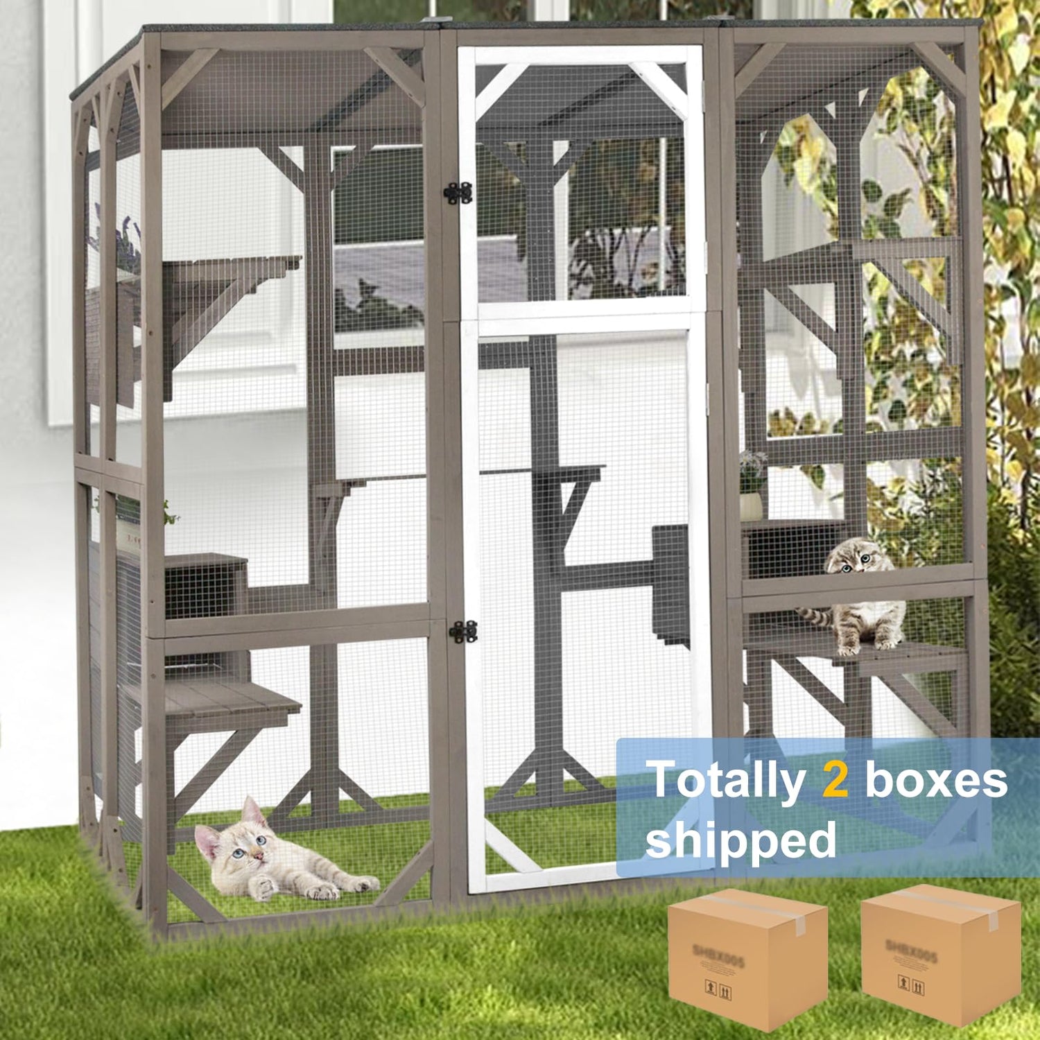 - 【Ideal Place for Pet Cats】With two lounges, seven jumping platforms and two lockable doors, this catio outdoor cat enclosure has plenty of room to climb and unleash your nature.