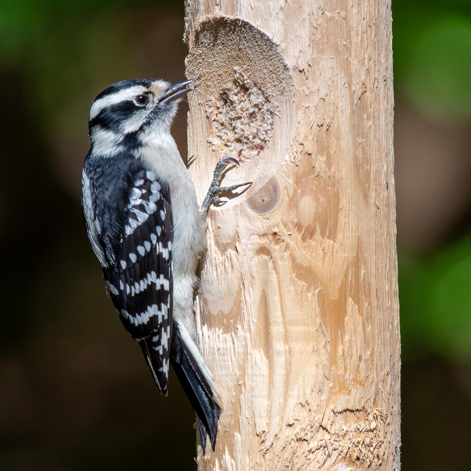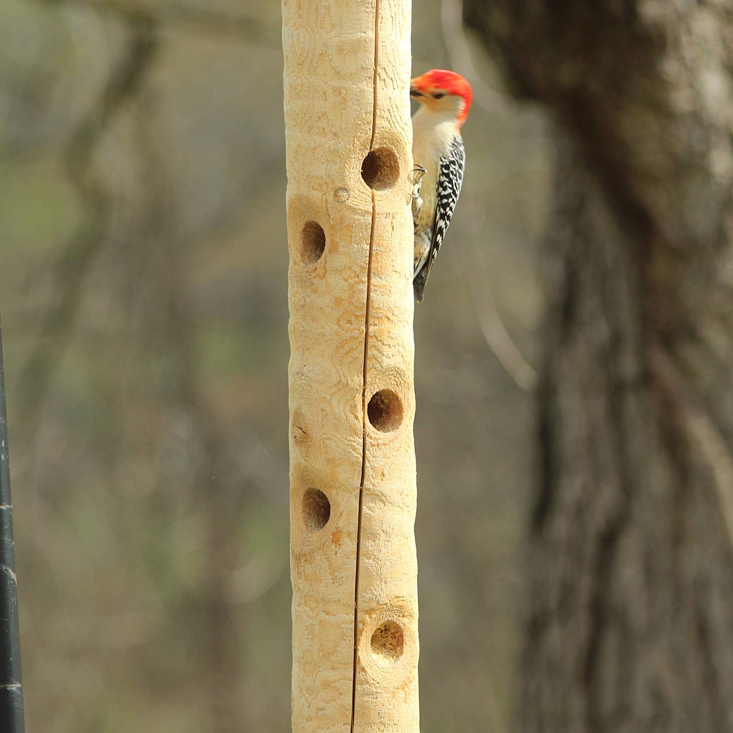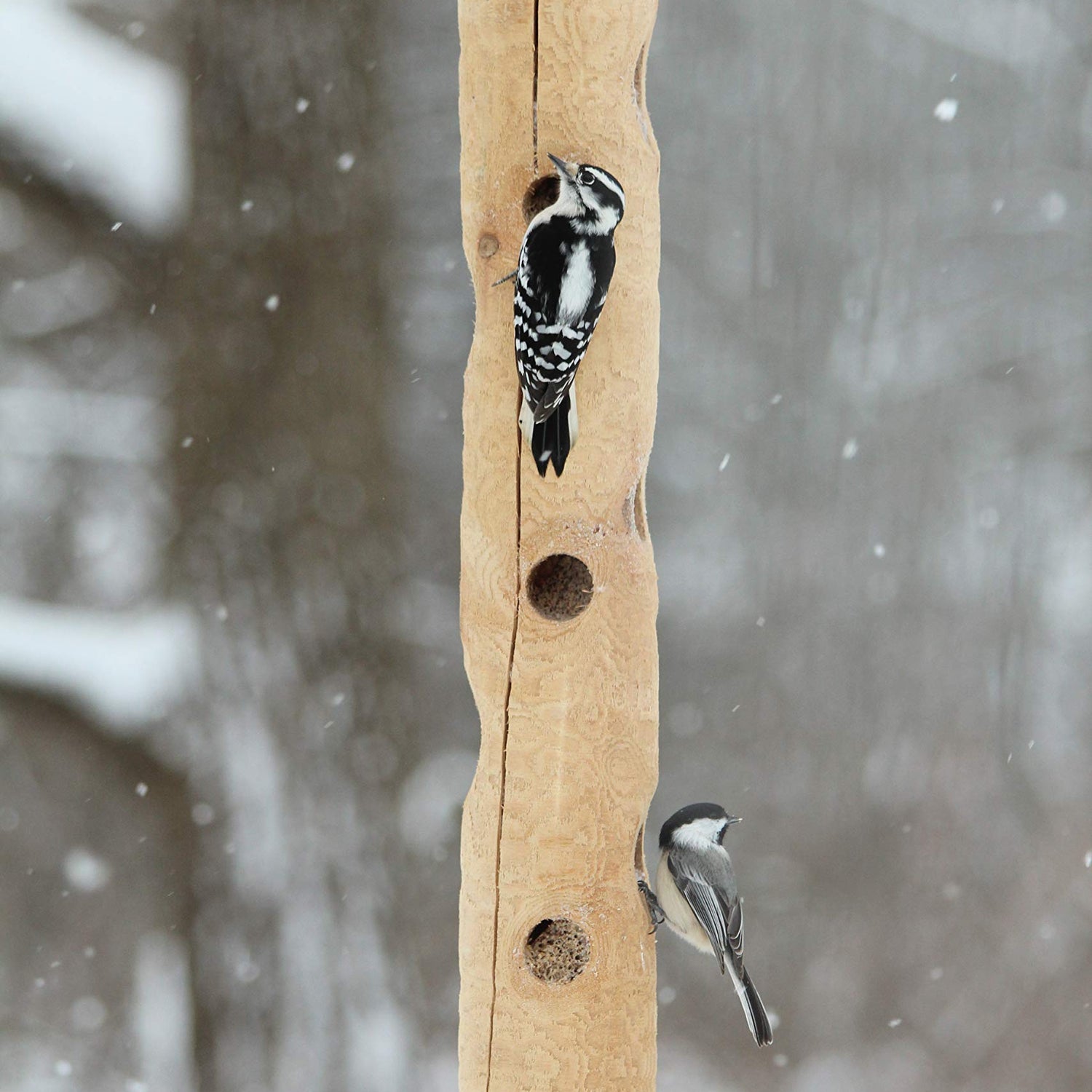 Details: Solid cedar log with eight holes for use with any suet plugs on the market. Also works great with spreadable suet or peanut butter. Sprinkle seeds, dried fruit, or dried mealworms on the suet or peanut butter for a special treat. Large open-ended hook for hanging. Perfect for clinging birds like woodpeckers, chickadees, and nuthatches. Cedar logs tend to crack as they dry, but they will not split all the way through. Fill the cracks with suet and seeds just like the holes!