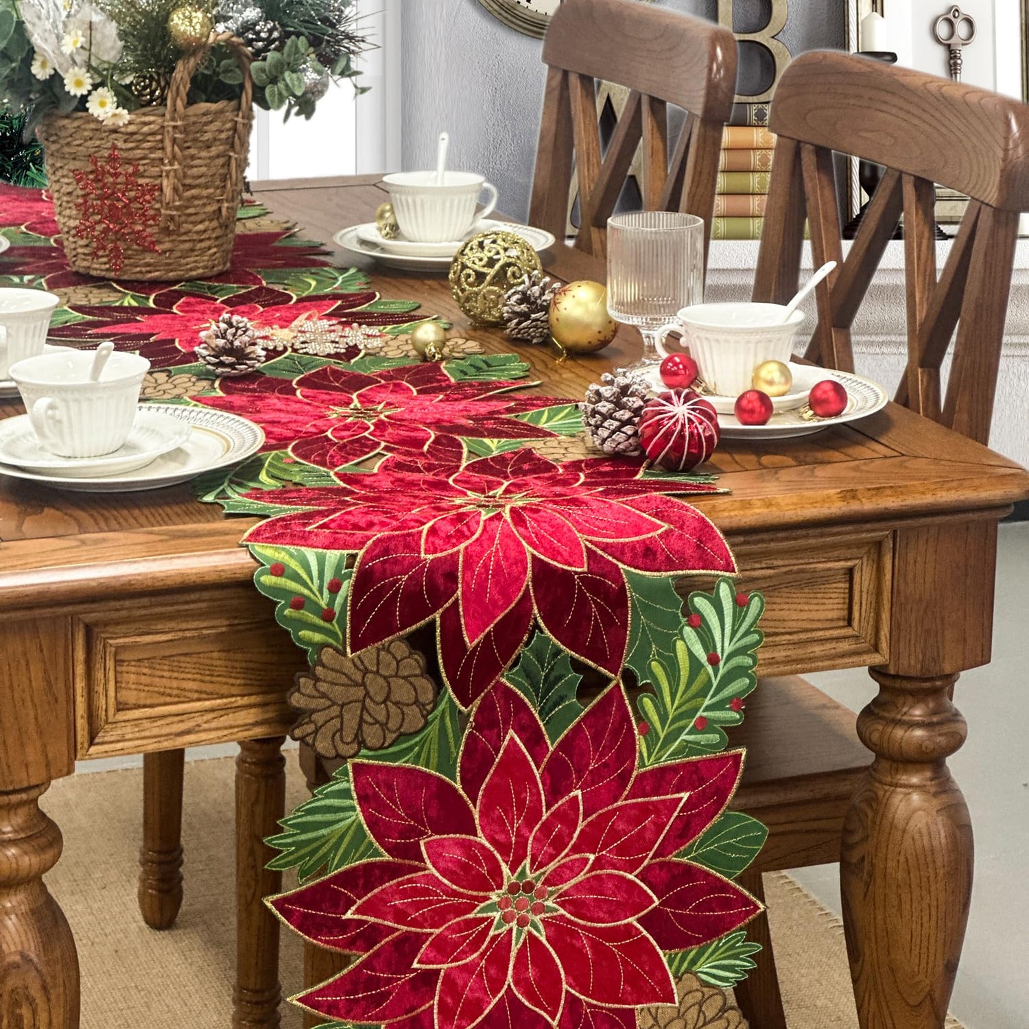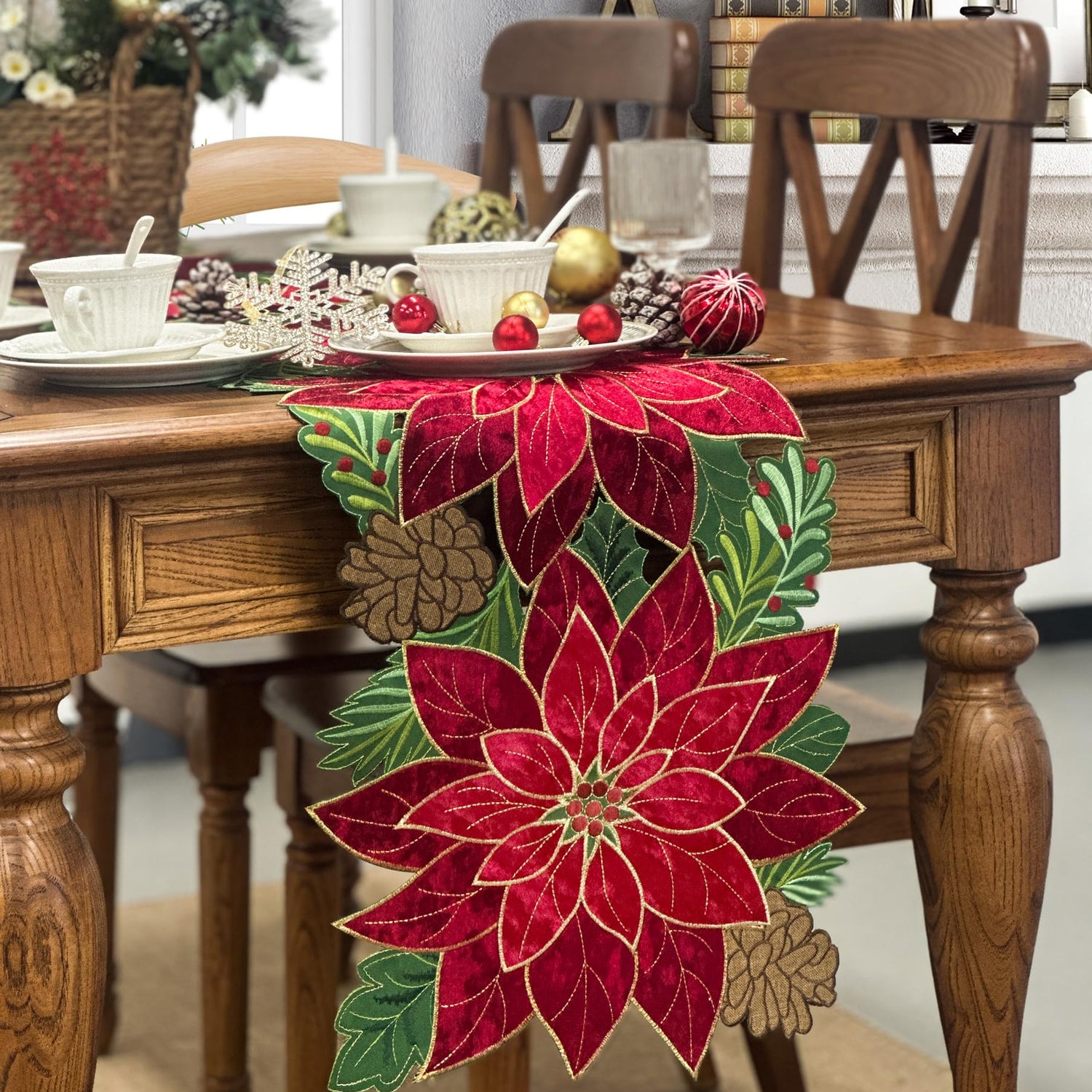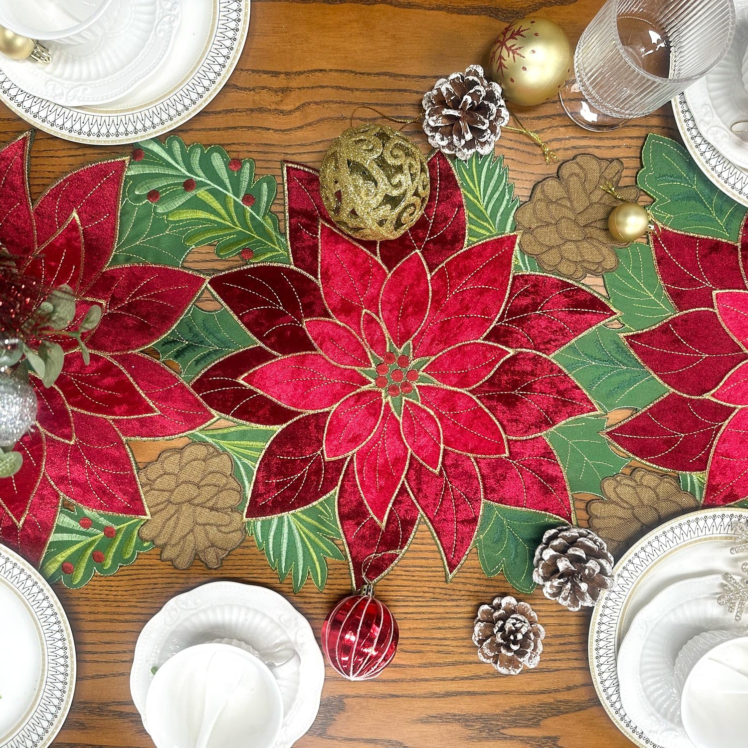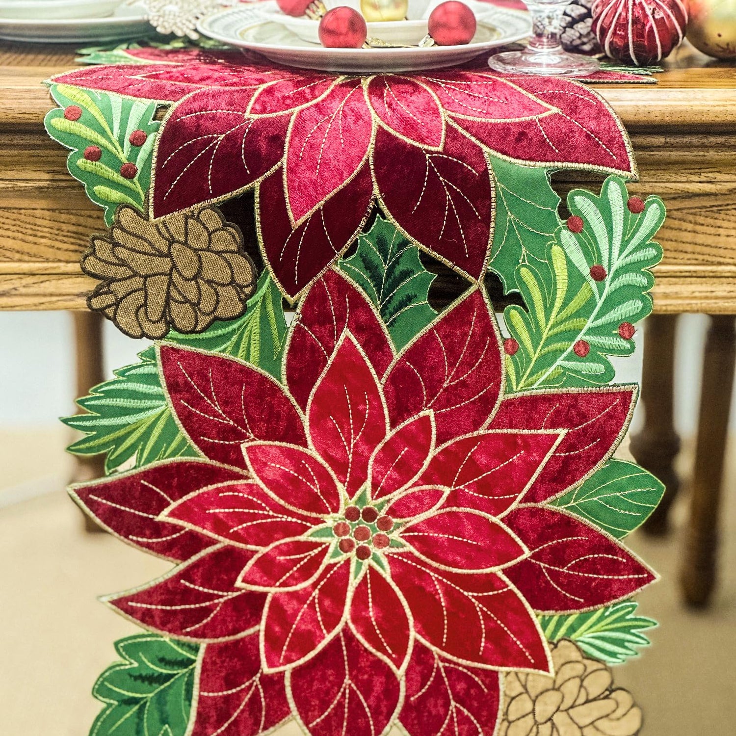 - Unique Design: This elegant Christmas table runner is hand-made cutwork design with delicate embroidery stitching, classic red Poinsettia flower appliques to lighten your Christmas and Holiday Dining Table. Two different red color of Poinsettia flowers are made with high-quality velvet fabric to get more comfortable touch and warm your Christmas home. Adding green Christmas holly and coffee pinecone to make this table runner more colorfully and lovely