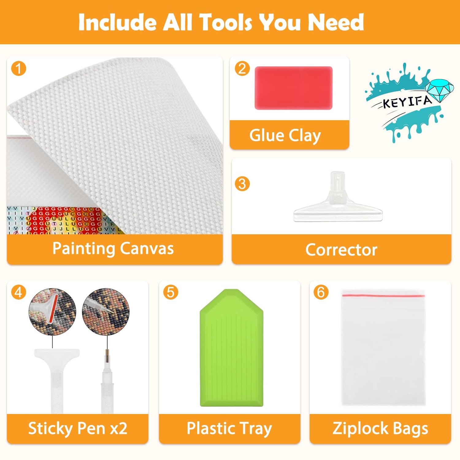 - COMPLETE KIT: DIY Diamond Painting Kit contains all the tools you need to get started. In addition to the canvas and enough round diamonds, it comes with 2 diamond pens, 1 replaceable correction pen, tray, glue block, and plastic bags. Open the package and you can start immediately!