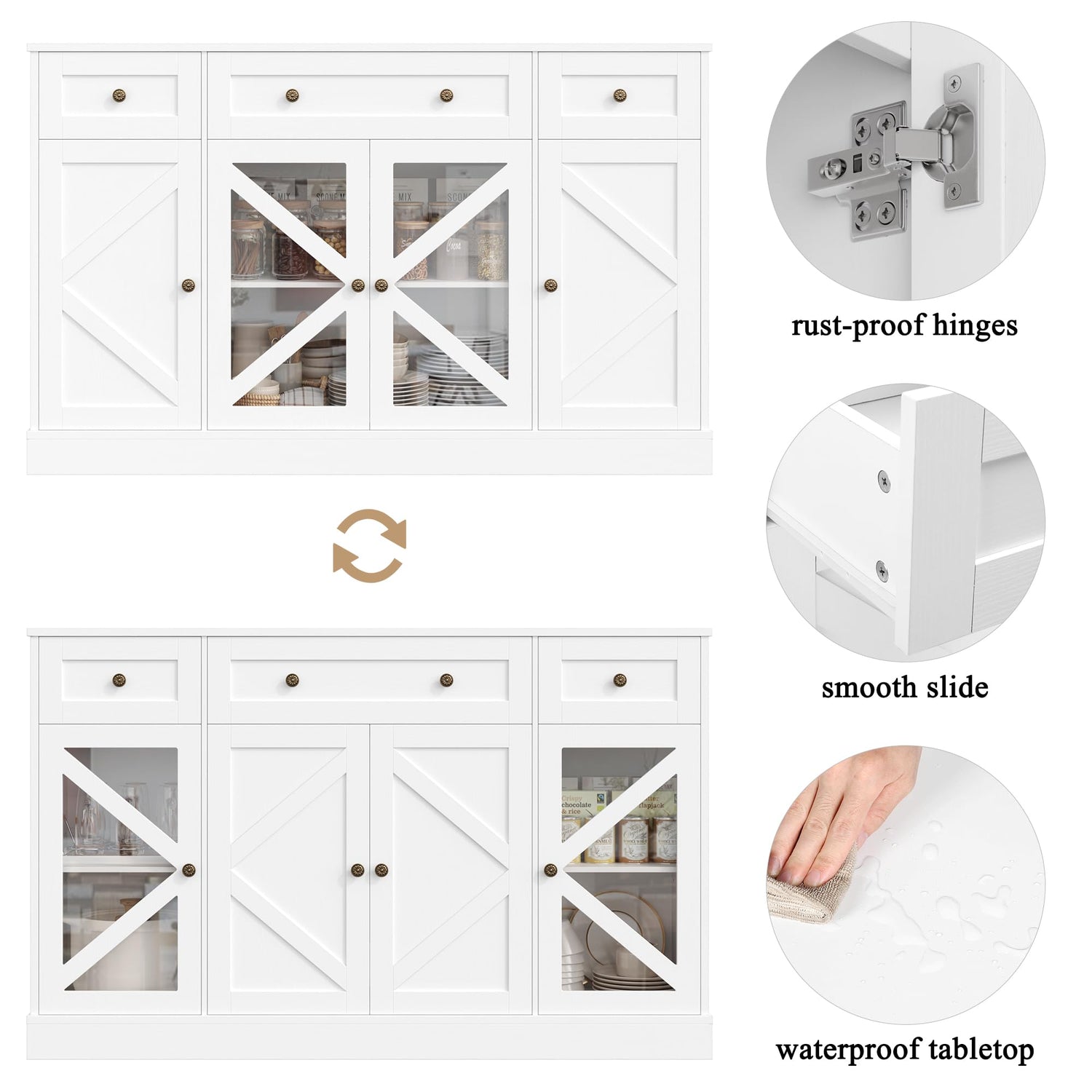 Keyluv Buffet Sideboard 55" Large Storage Cabinet 4 Doors and 3 Drawers, Farmhouse Wooden Coffee Bar Space-Saved Cupboard Furniture for Dining Room, Kitchen, Living Room, White