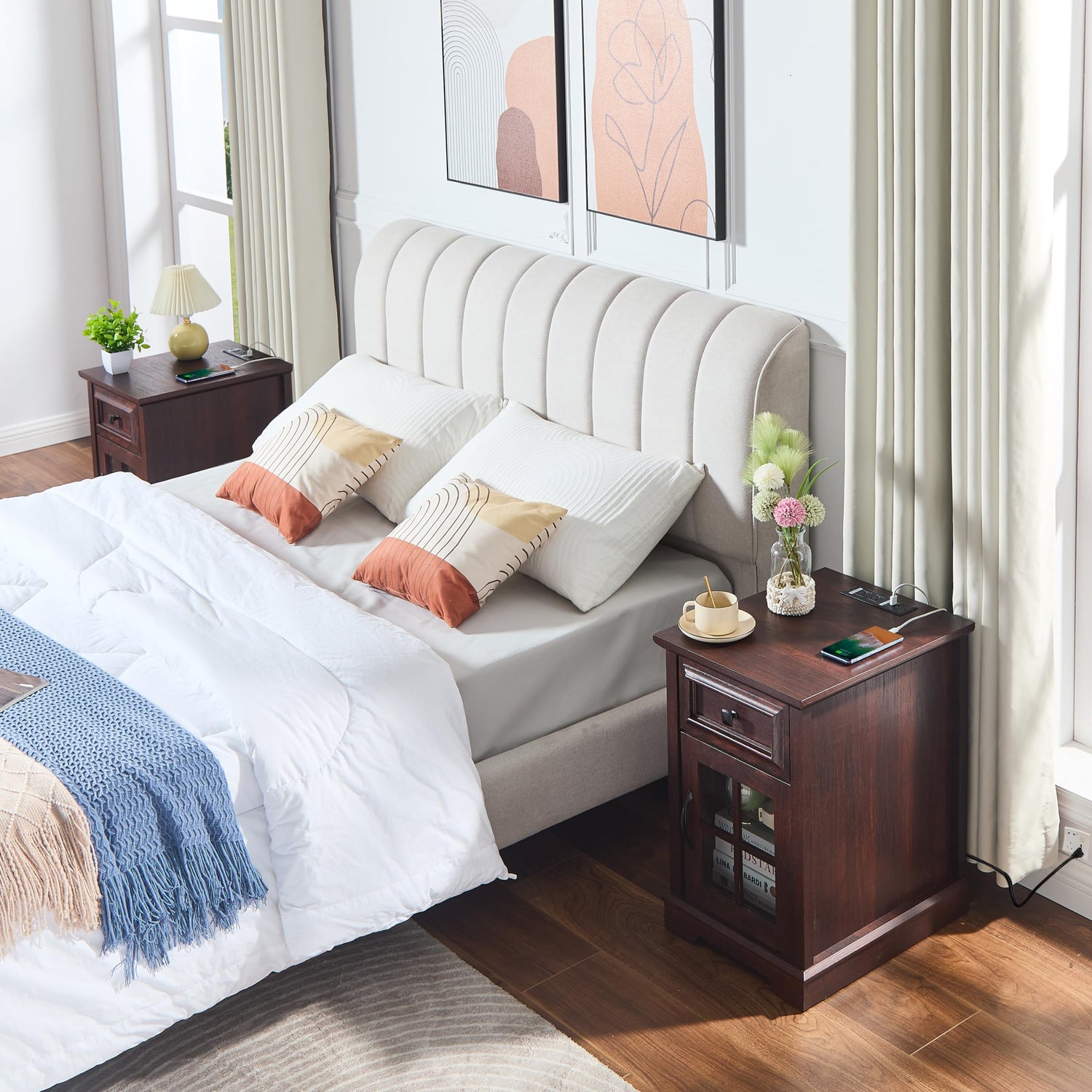 - đăNightstand with Drawer and Glass Door StorageăThis bedroom side table has a Drawer and Glass Door Storage, Which can hold a lot of personal items and less frequently used items, helping you organize the items in the small space! This Side Table with Charging Station can hold common items such as decorations, cell phones, books, record players, etc.