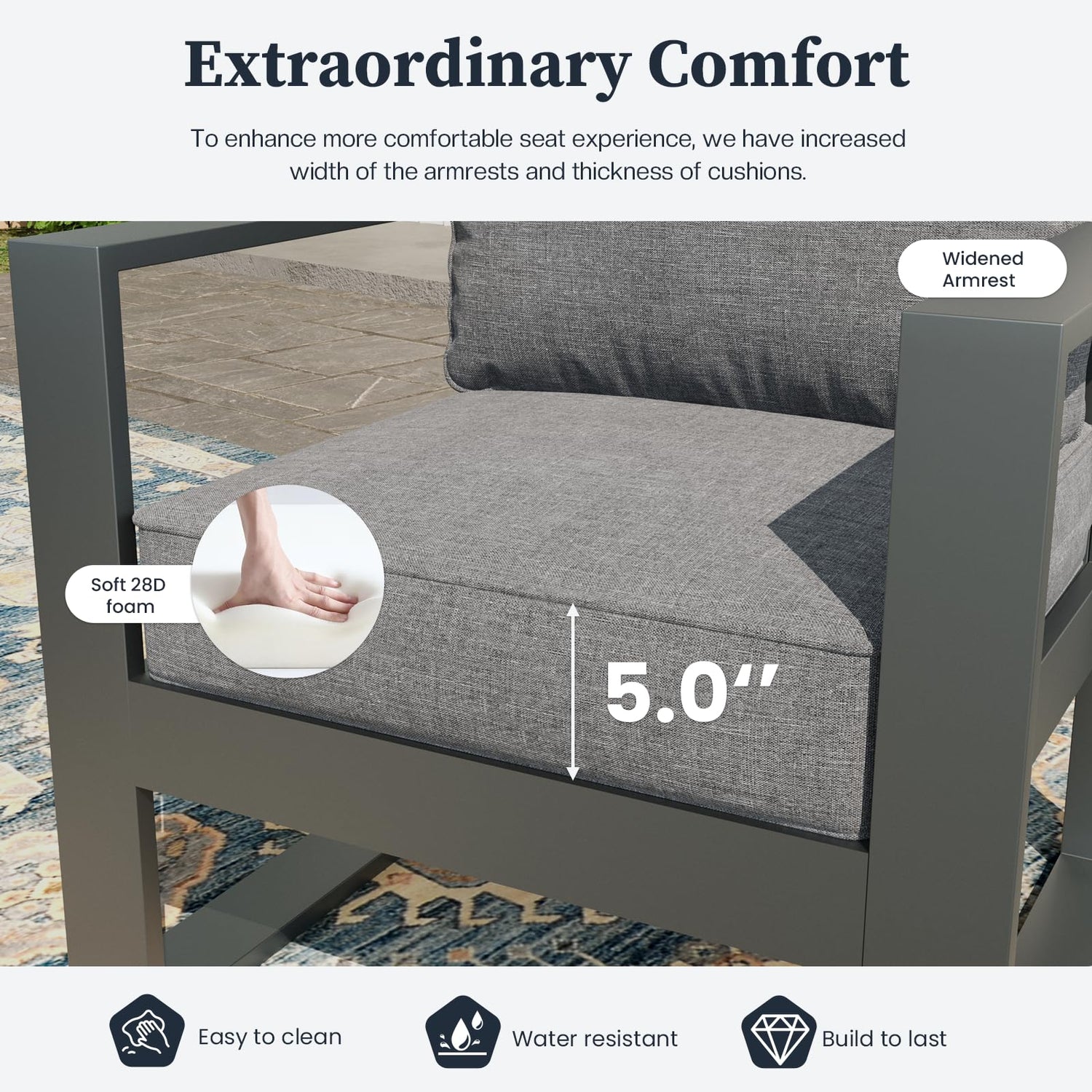 - PRODUCT INCLUDING: This aluminum furniture set includes 2 x armchairs, 1 x loveseat, 1 x 3-seat sofa, and 1 x fire pit table. Come with 4 boxes that may not arrive at the same time.