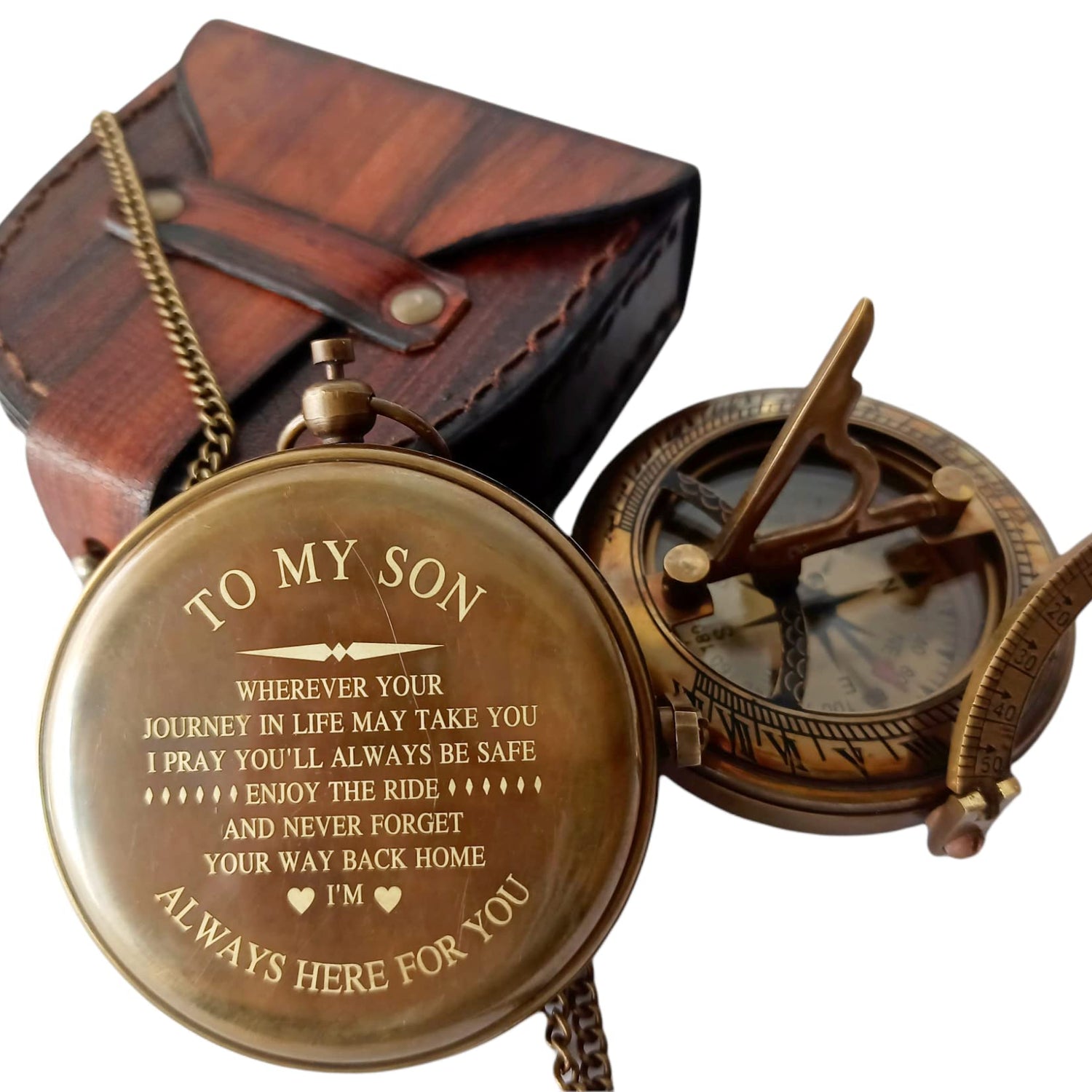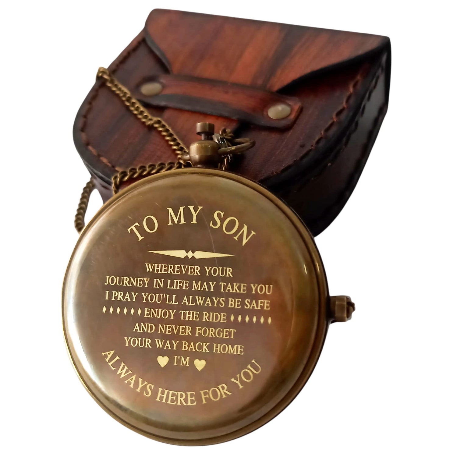 - Brass compass Engraved With A Special Quote Saying "To my son: wherever your journey in life may take you, I pray you’ll always be safe. Enjoy the ride and never forget your way back home. I’m always here for you." What’s more unique than a personalized gift? Saying never comes off so the personalized gift will be appreciated by your son for many years to come.