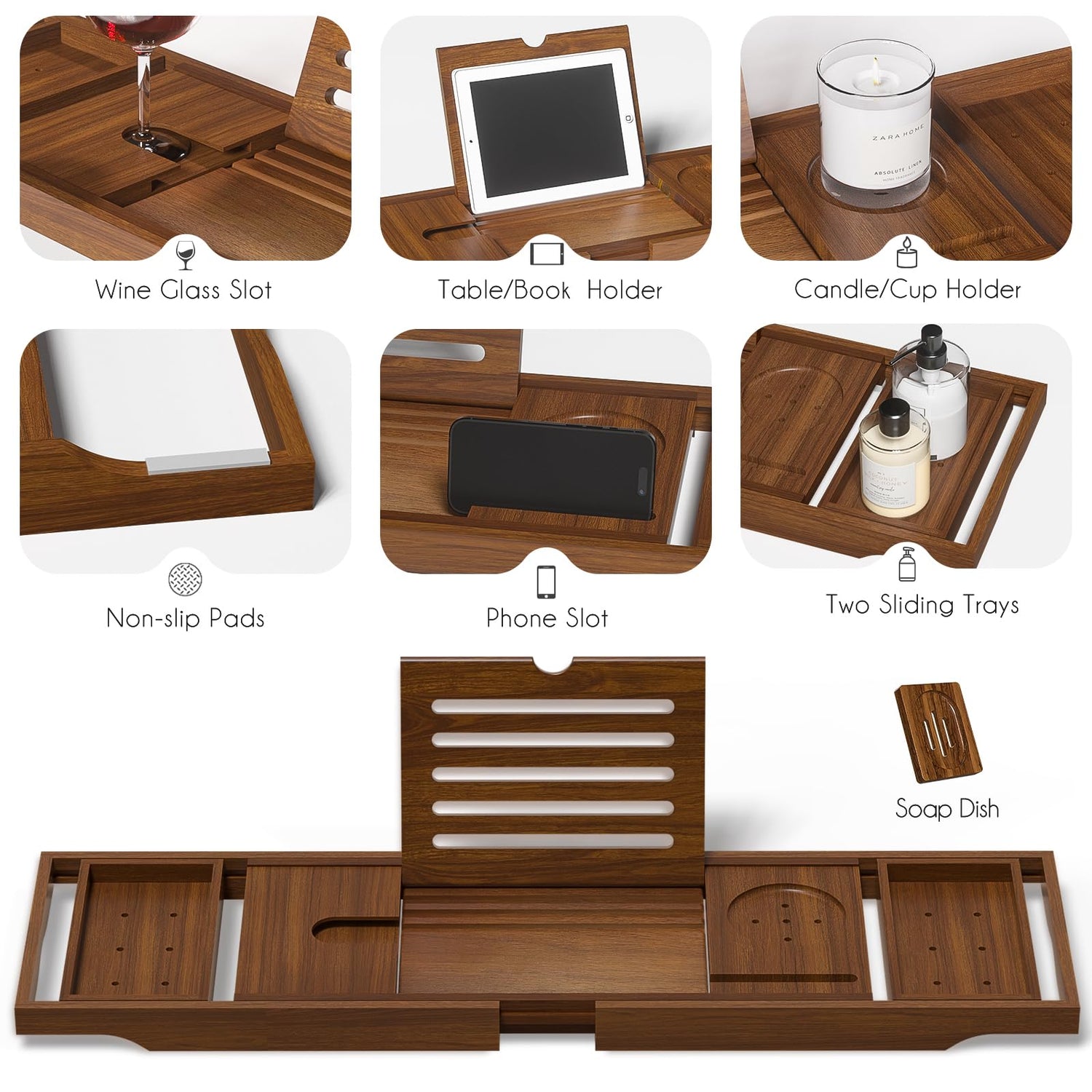 - Luxury Home Bath Tray: bath tub caddy comes with slots for a phone, a wine glass slot, a scented candle/water glass slot, 2 trays and tablet/bookshelf, plus a soap holder. Enjoy a spa day at home with a bath table tray that can be used to store all your favorite personal items to make your bathing experience as comfortable as possible