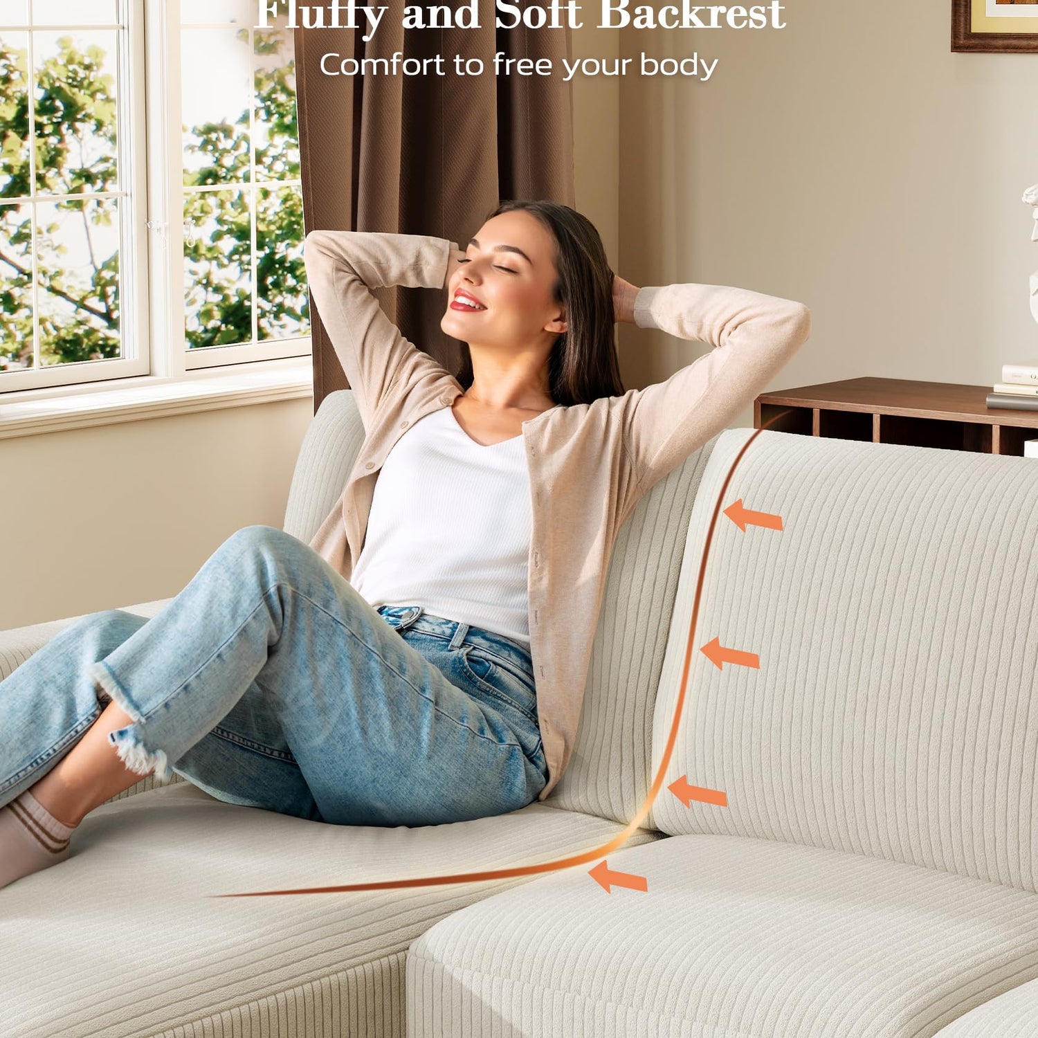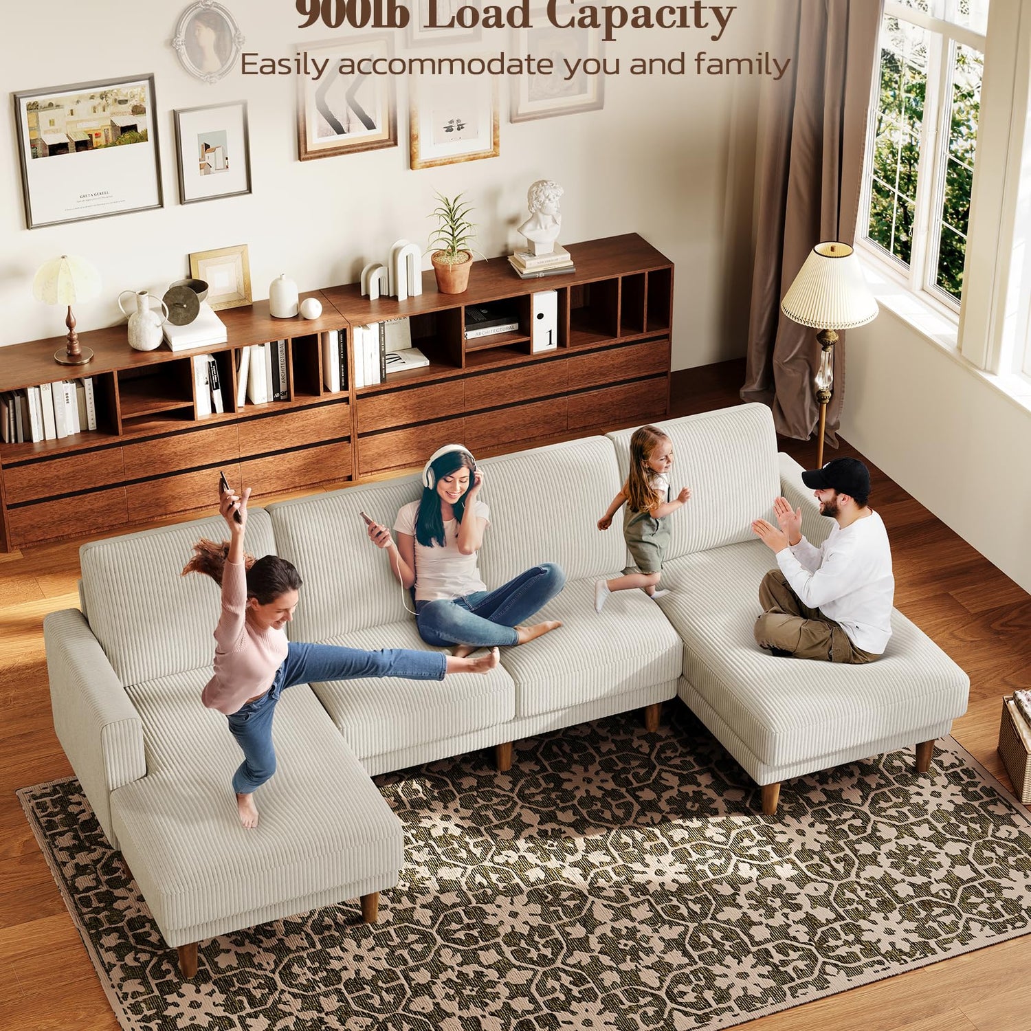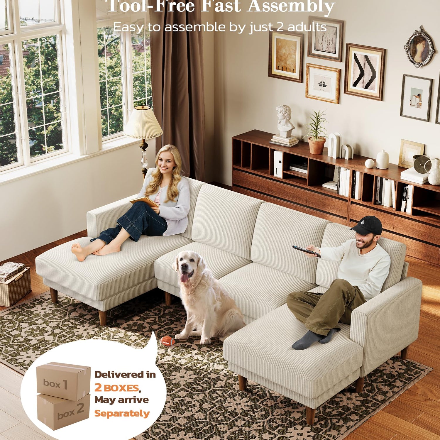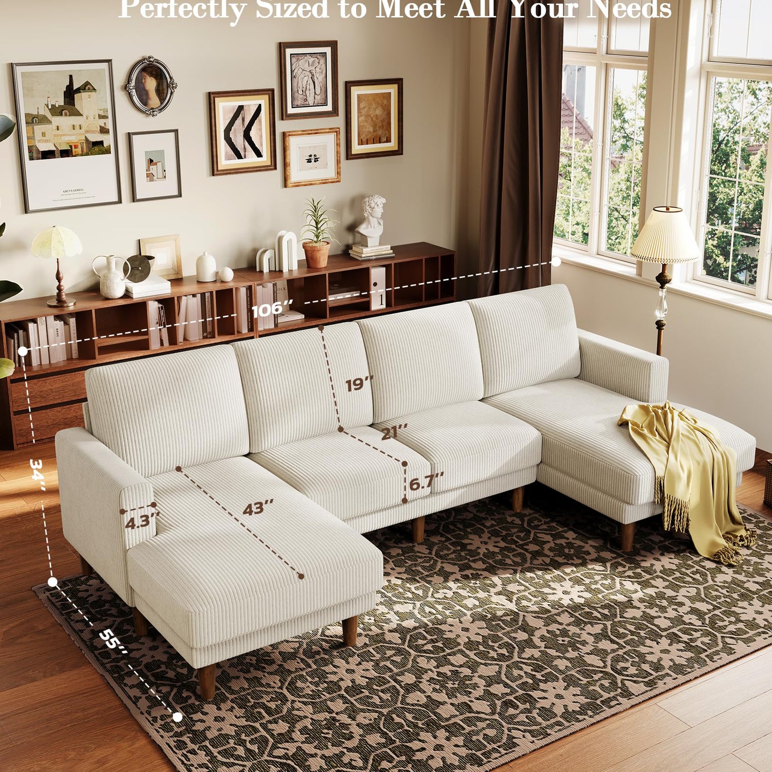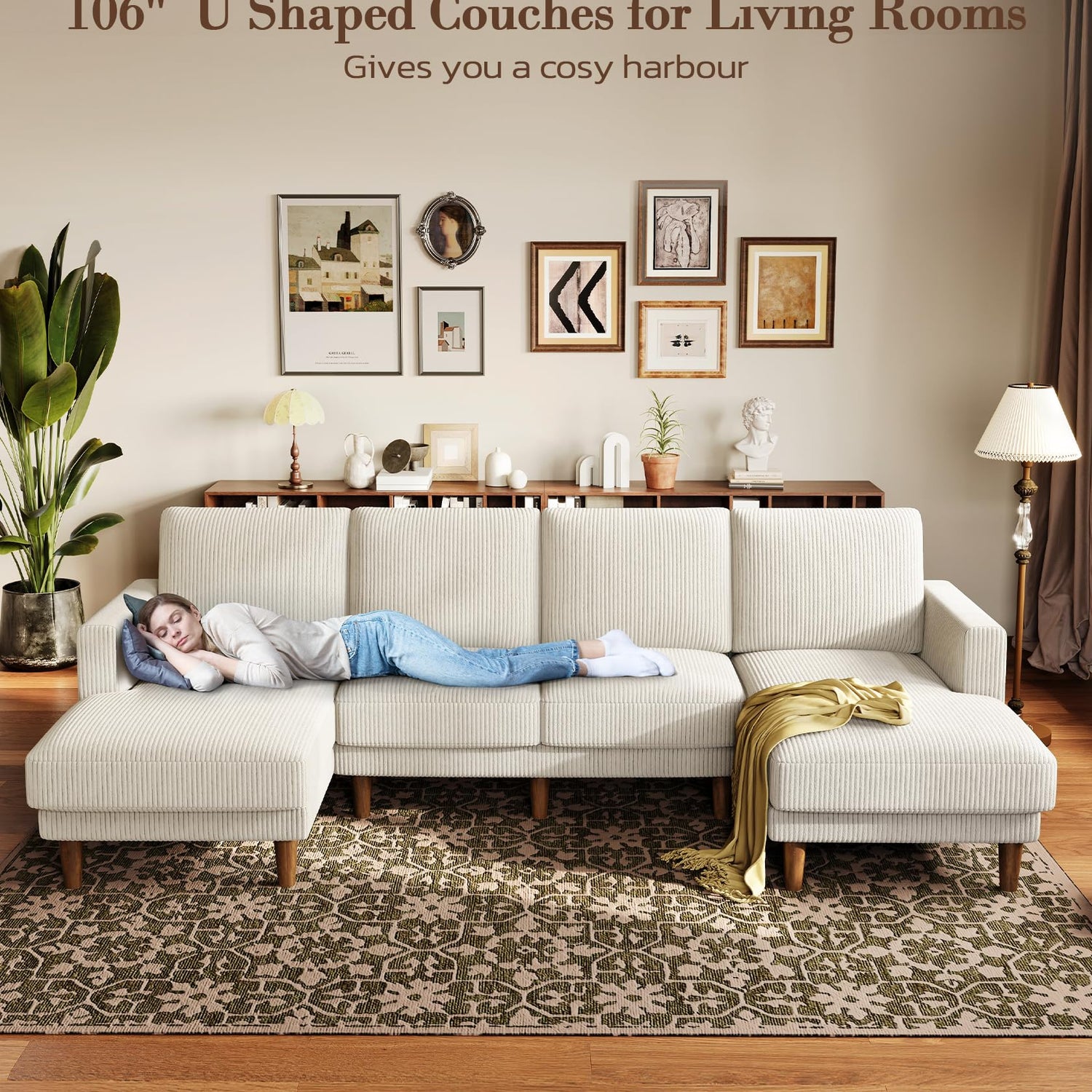 Kidirect 106" Beige U Shaped Couch with Chaises, Corduroy Sectional Couches for Living Room No Tool Assembly, 4 Seats Loveseat Sofa Comfy Sectional Sofas for Living Room Apartment Home 900lb Load