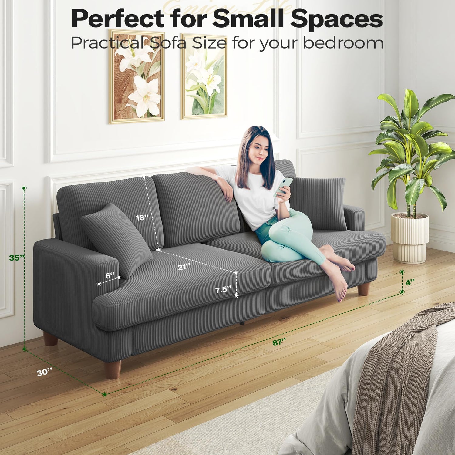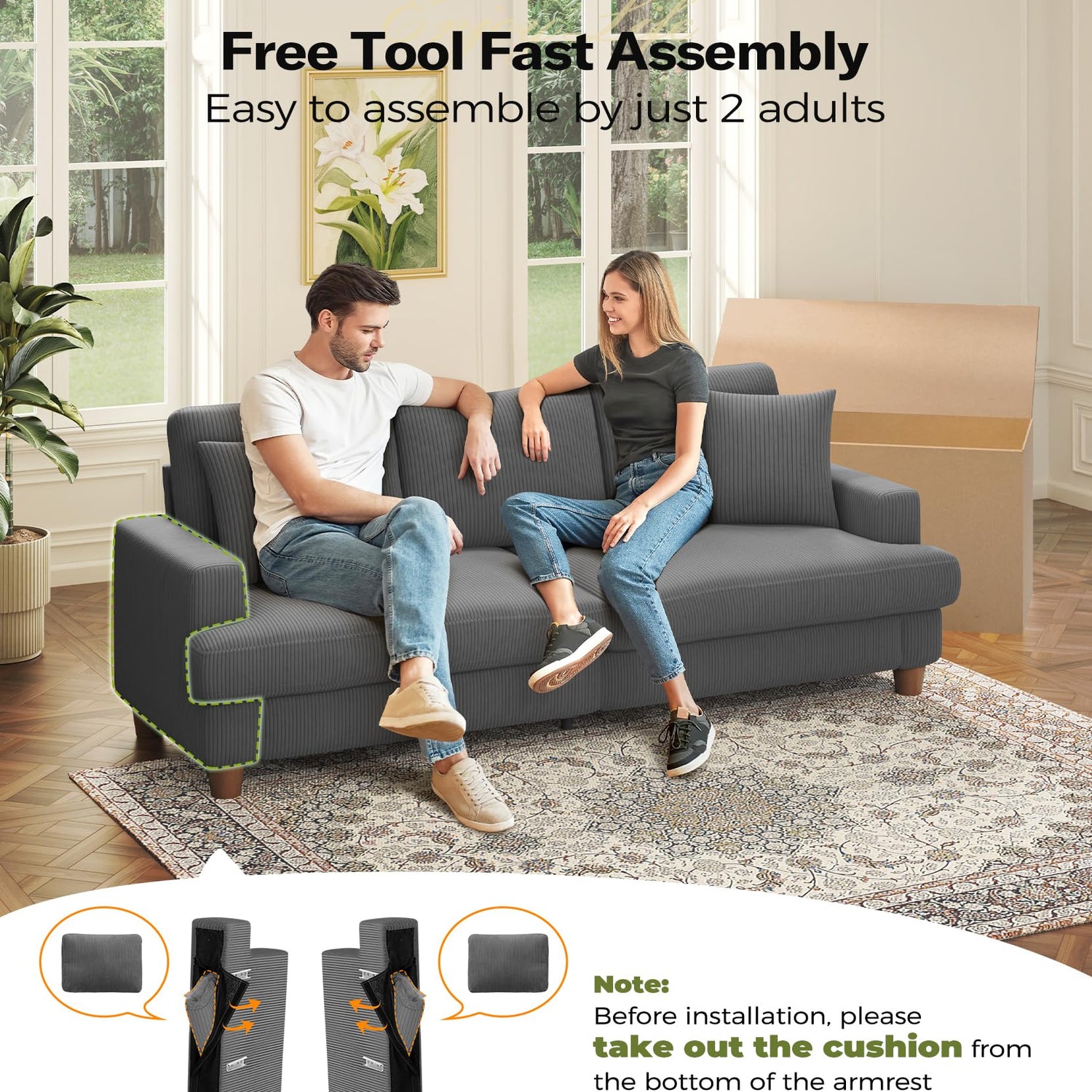 - 【 15-Min Tool-Free Assembly - 15 Minutes, Done! 】 No tools? No problem! Assembling this loveseat sofa is a breeze—no extra tools needed. Two adults can put the grey corduroy couch together in just 15 minutes (we're not kidding!). Just watch the assembly video on the product page and follow the included instructions, and you'll have your new couches for living room ready to use in no time. Kidirect couch dimensions: 87"W x 30"D x 35"H — perfect for fitting into your space without hassle.
