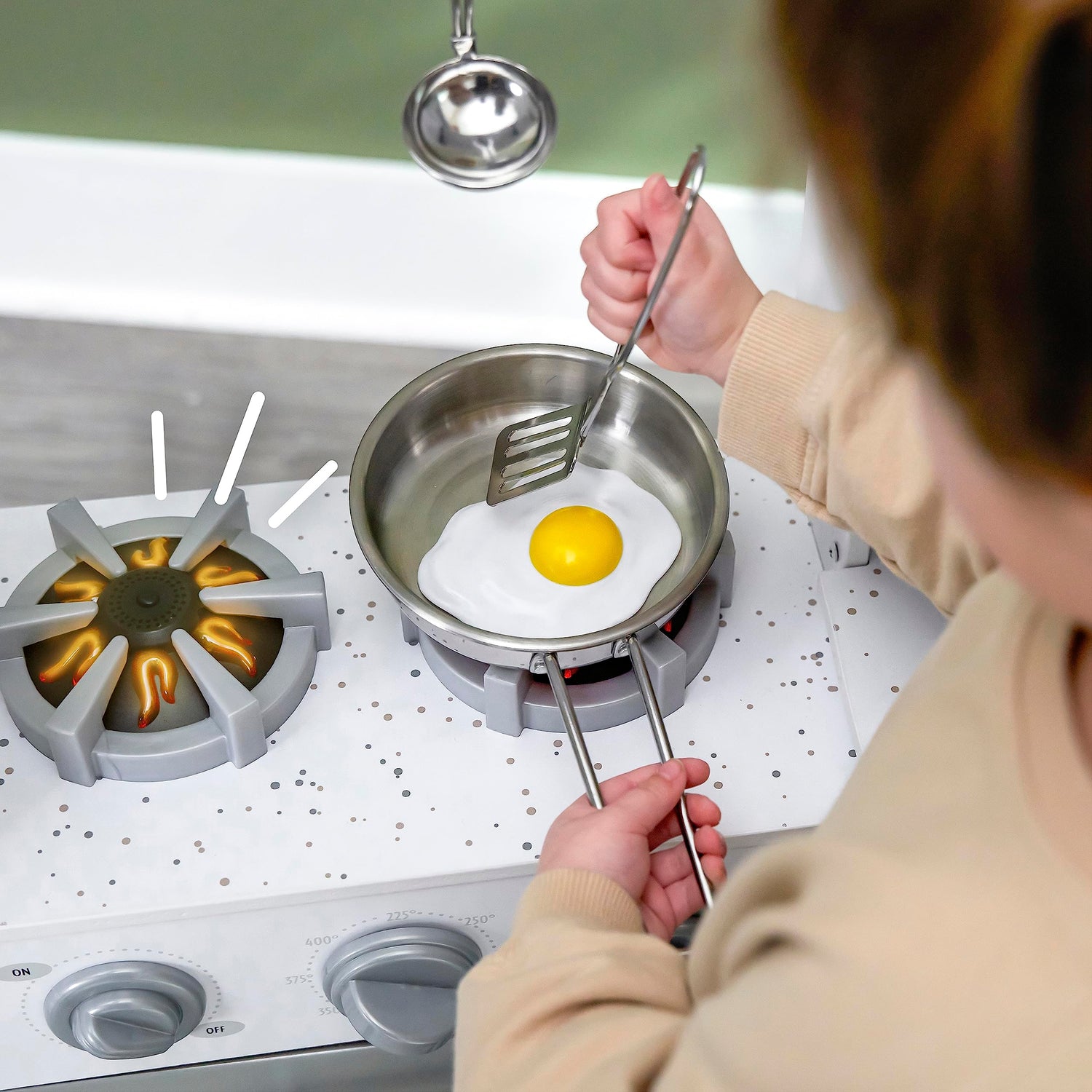 - LIGHTS & SOUNDS: The burners light up and make cooking sounds; water dispenser also lights up and makes realistic sounds when pressed.