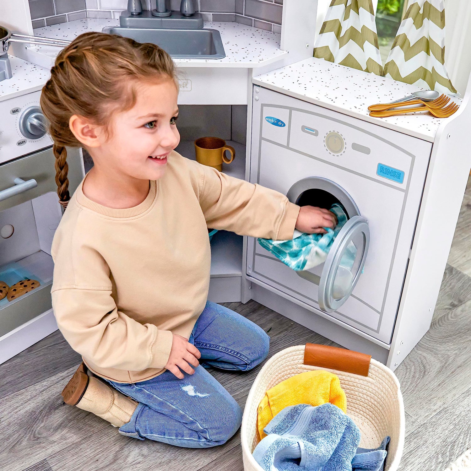- MADE OF WOOD & EASY ASSEMBLY: Kitchen is made of premium, sustainable materials for long-lasting play you can feel good about. Make assembly easier with more help! Two people can set up this item in approximately 2 hours or less.