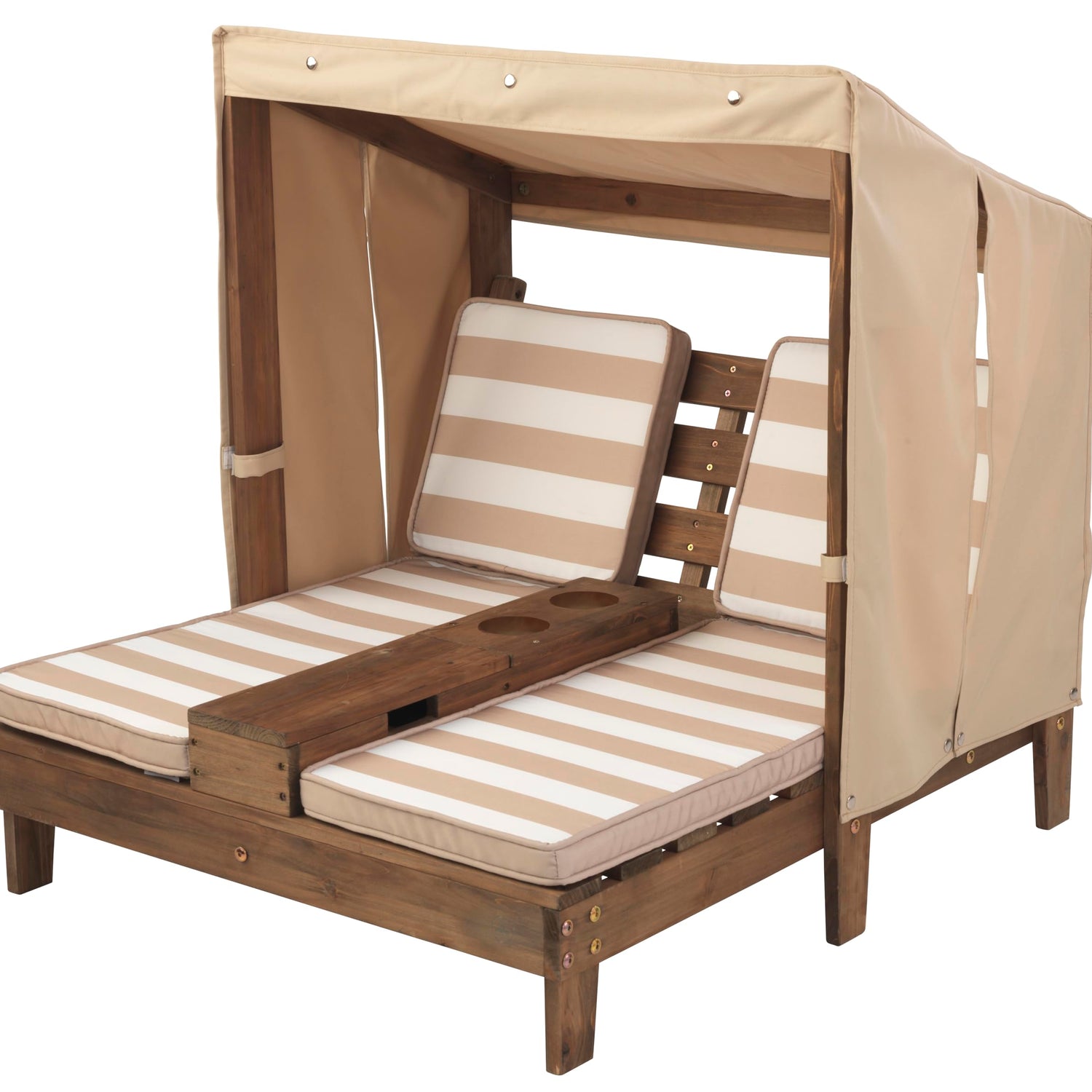 Details: When the weather gets warm, your children will love to "chill" under the KidKraft Double Chaise Lounge's three-sided canopy. There's plenty of room for two friends to kick back and relax on a hot summer day, just like mom and dad. A pair of cup holders are perfect for cold drinks or even to hold snacks or bubble wands. There's even built in storage for sunglasses or toys. The high-quality, weather-resistant construction and sturdy canvas will keep this cute lounger looking good through all the seasons.