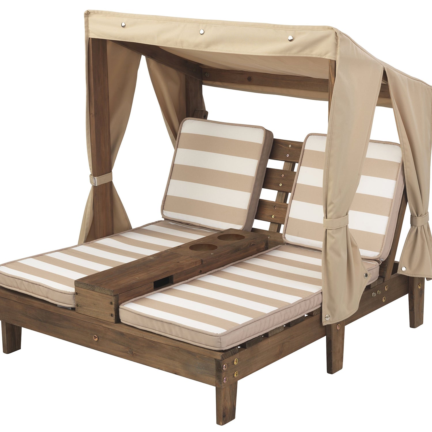 KidKraft Wooden Outdoor Double Chaise Lounge with Cup Holders, Patio Furniture for Kids or Pets, Espresso with Oatmeal and White Striped Fabric