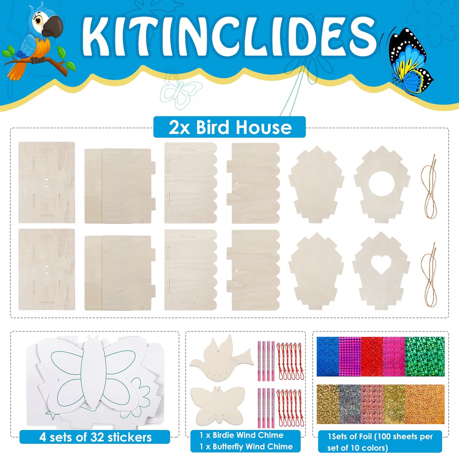 Kids Crafts for Ages 6-14, 2 Pack Montessori Bird House/Foil/Wind Chime/Stickers, Genius Designer DIY Birdhouse Wooden Art Set, Idea Birthday for Girl Boy Children 6 7 8 9 10 Year Old