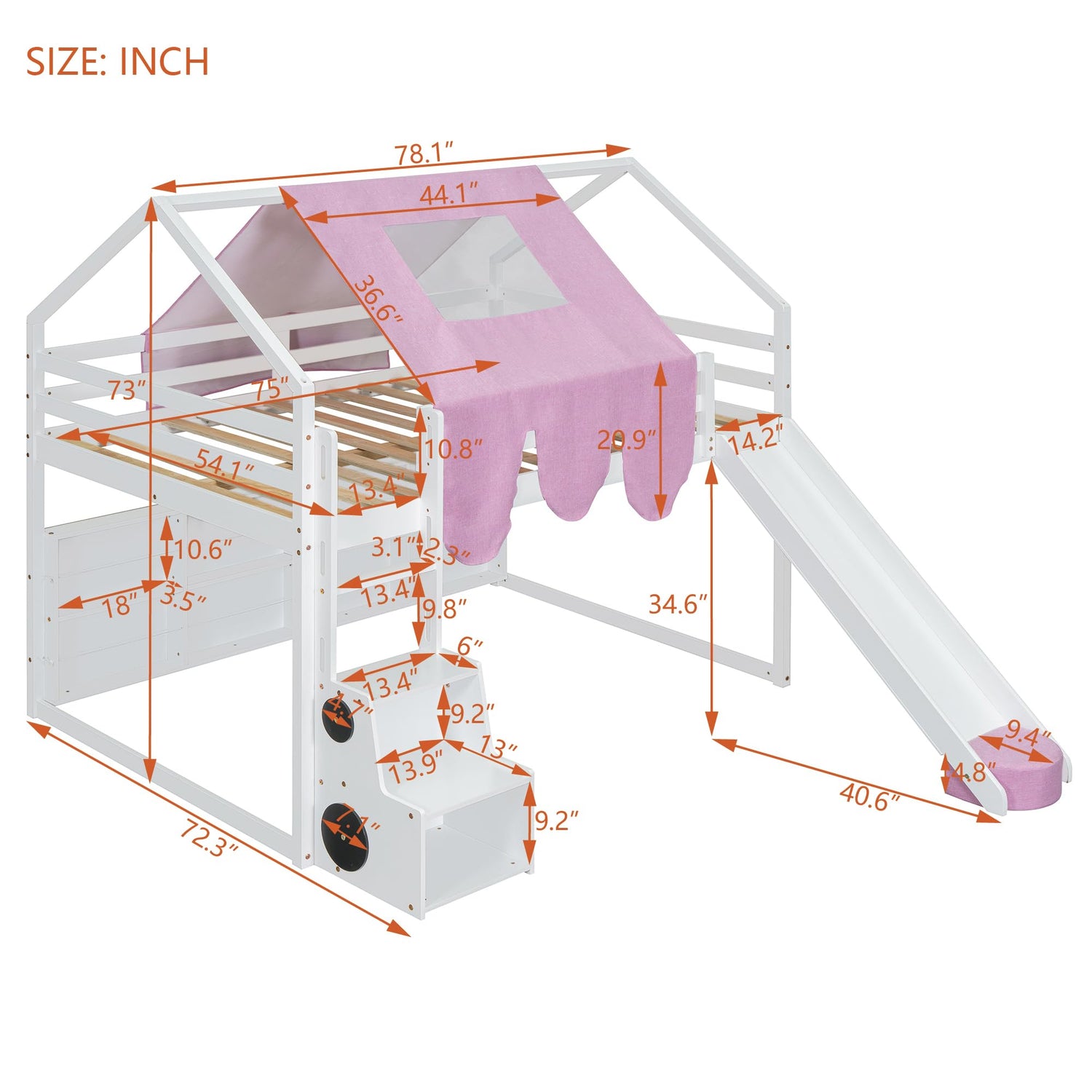 Kids Loft Bed Full Size, Full Loft Bed with Slide and Ladder, Kids House Loft Bed with Storage Shelf and Removable Tent, Full Size Loft Bed for Girls, Boys(Full White Pink)