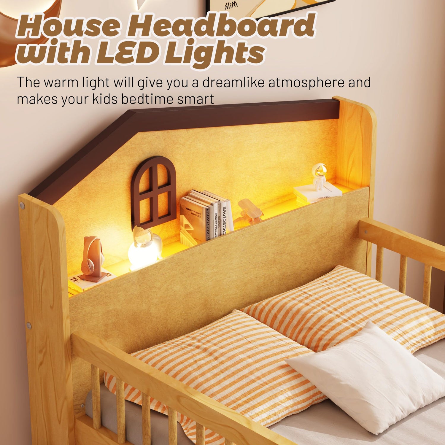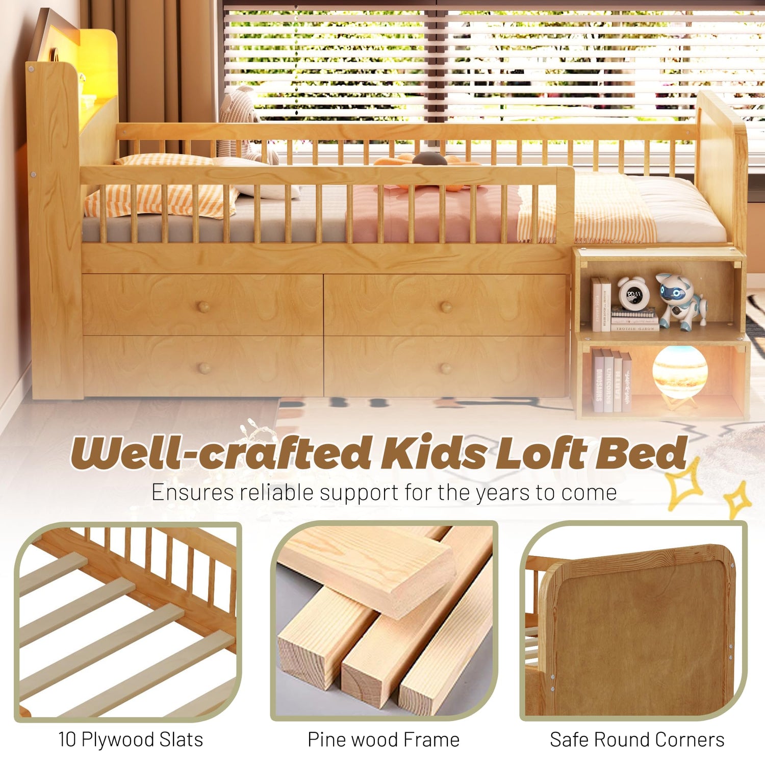 Kids Loft Bed with LED Lights,Wooden Low Loft Bed Twin with House Shape Headboard, 4 Storage Drawers and Stairs for Girls Boys,No Box Spring Needed, Natural