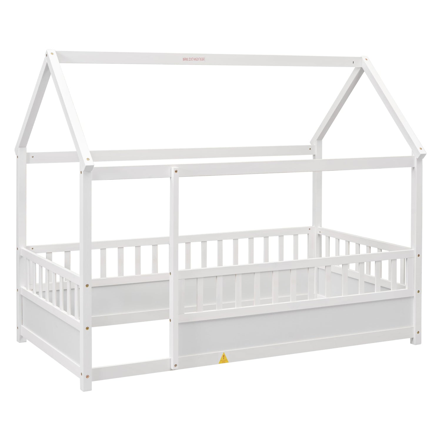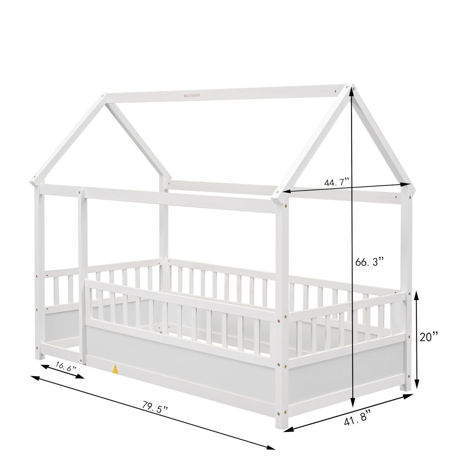 Kids Montessori Bed Twin Size, Twin Floor Bed with High Fence, House Bed for Kids, Girls, Boys, Wood Montessori Floor Bed Without Slats(White Twin)