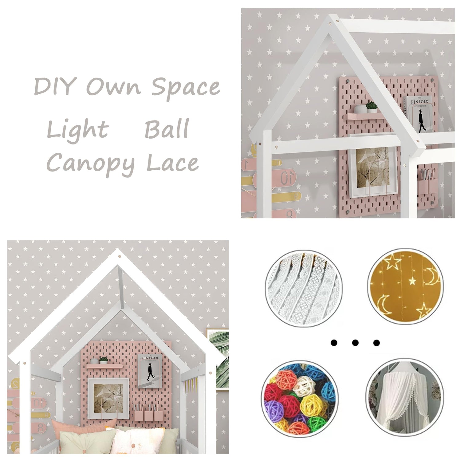 - 🏆🏆 【House Bed for Kids: DIY Own Sapce】Featuring house-shaped roof, fence and door, this twin size house bed creates a more fun & adorable sleeping space. Kids can DIY their own montessori floor bed to be more fantastic meanwhile increase interaction with your kids. You can freely DIY on the roof with valances, lamps and so on to create a dreamy sleeping space.