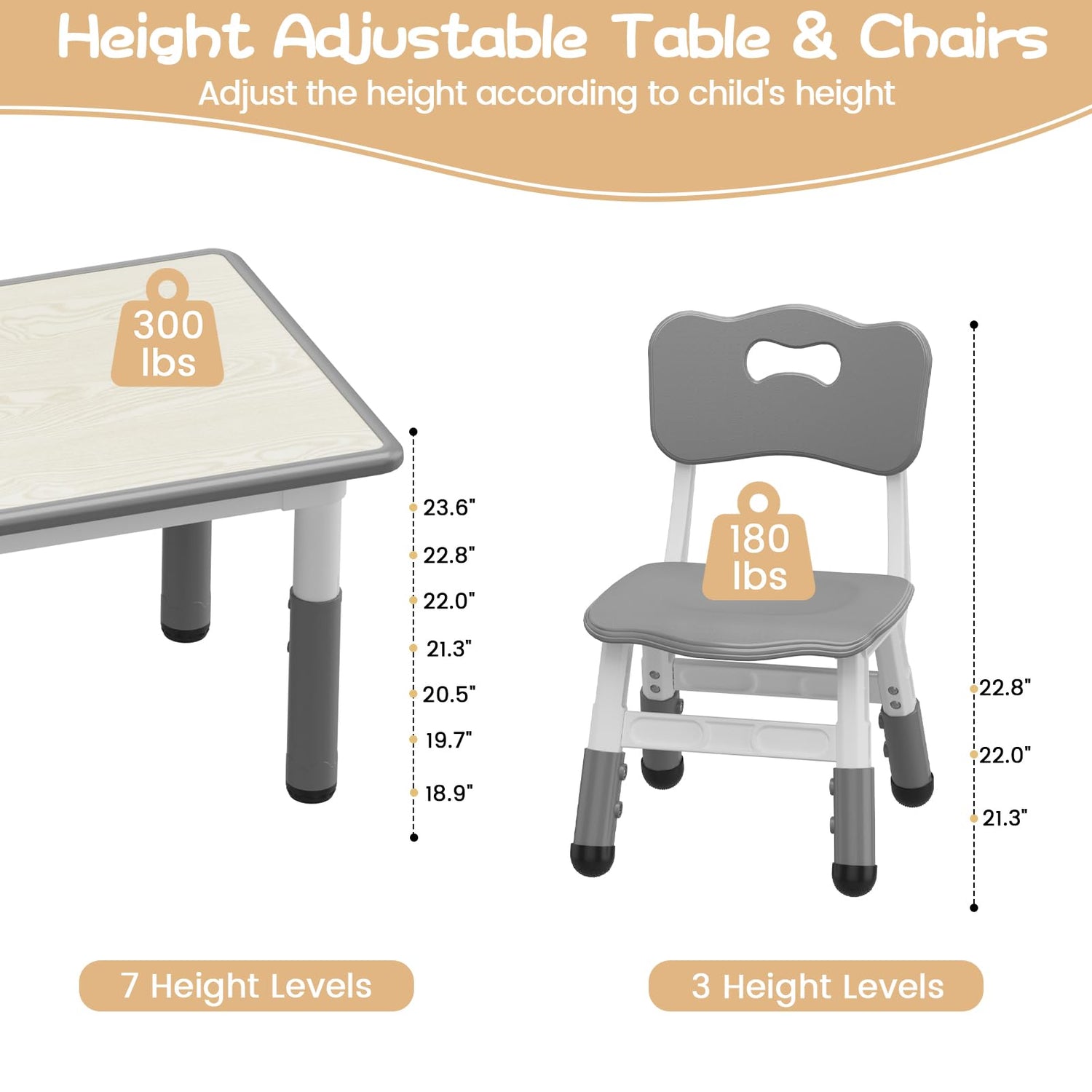 - 【Height Adjustable】Our kids table and chairs are both height-adjustable, suitable for kids from 3-8 years old. The table has 7 height levels: 18.9"-23.6" (48-60cm) and can hold up to 300 lbs. The chairs has 3 height levels: 10.6" (26cm), 11.4" (28cm), 12.2" (30cm), and has a maximum load capacity of 180 lbs. The toddler table and chairs set will accompany your baby to grow up!