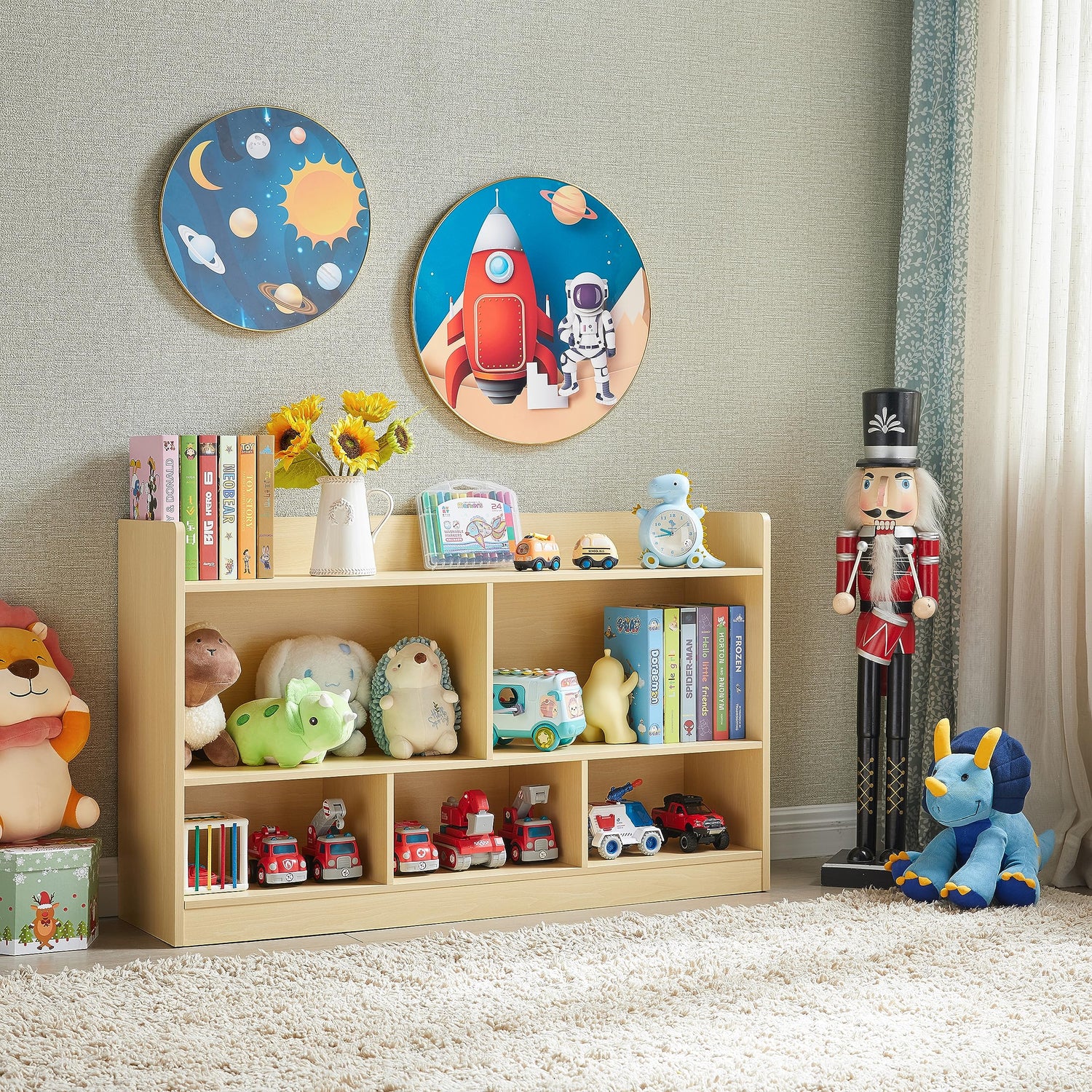 Natural Wooden 5-Section Kids Toy Storage Organizer & Bookshelf for Playroom, Nursery, and Classroom