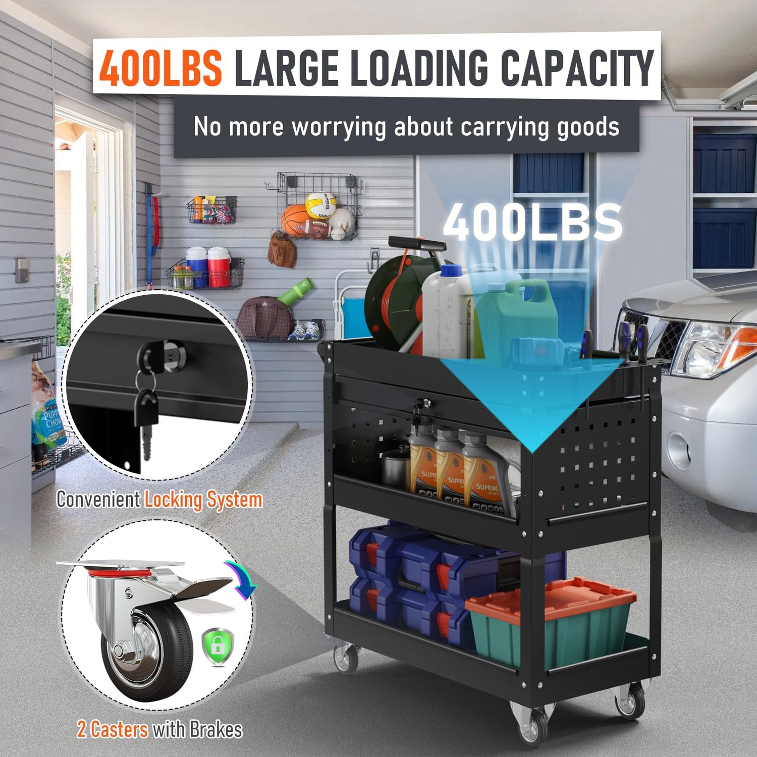 - Large Storage Capacity:rolling tool cart has 1 workbench, 2 large-size trays and 1 drawer with security lock and flexible ball slide, it can meet your needs of storing different tools and can withstand up to 400 lbs.