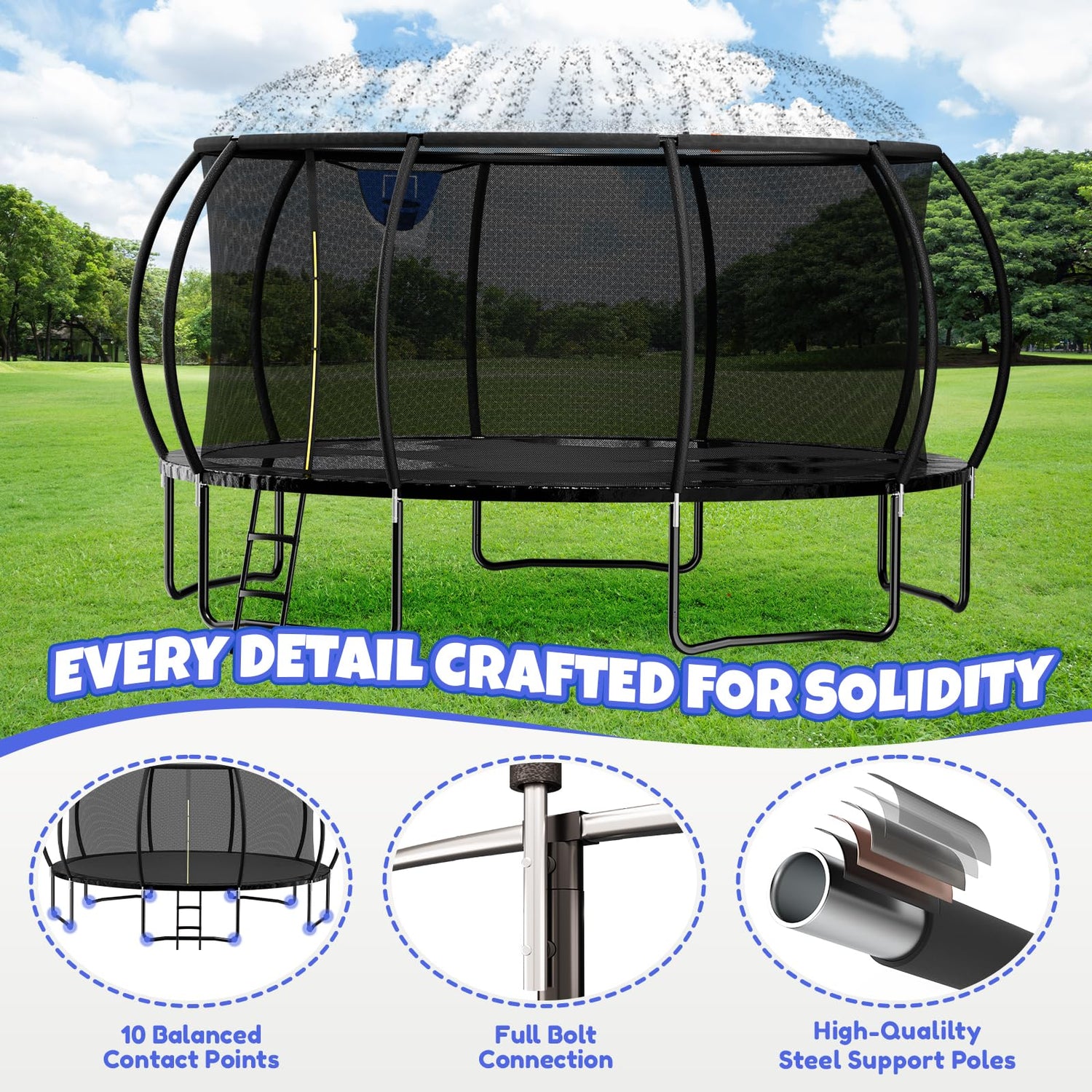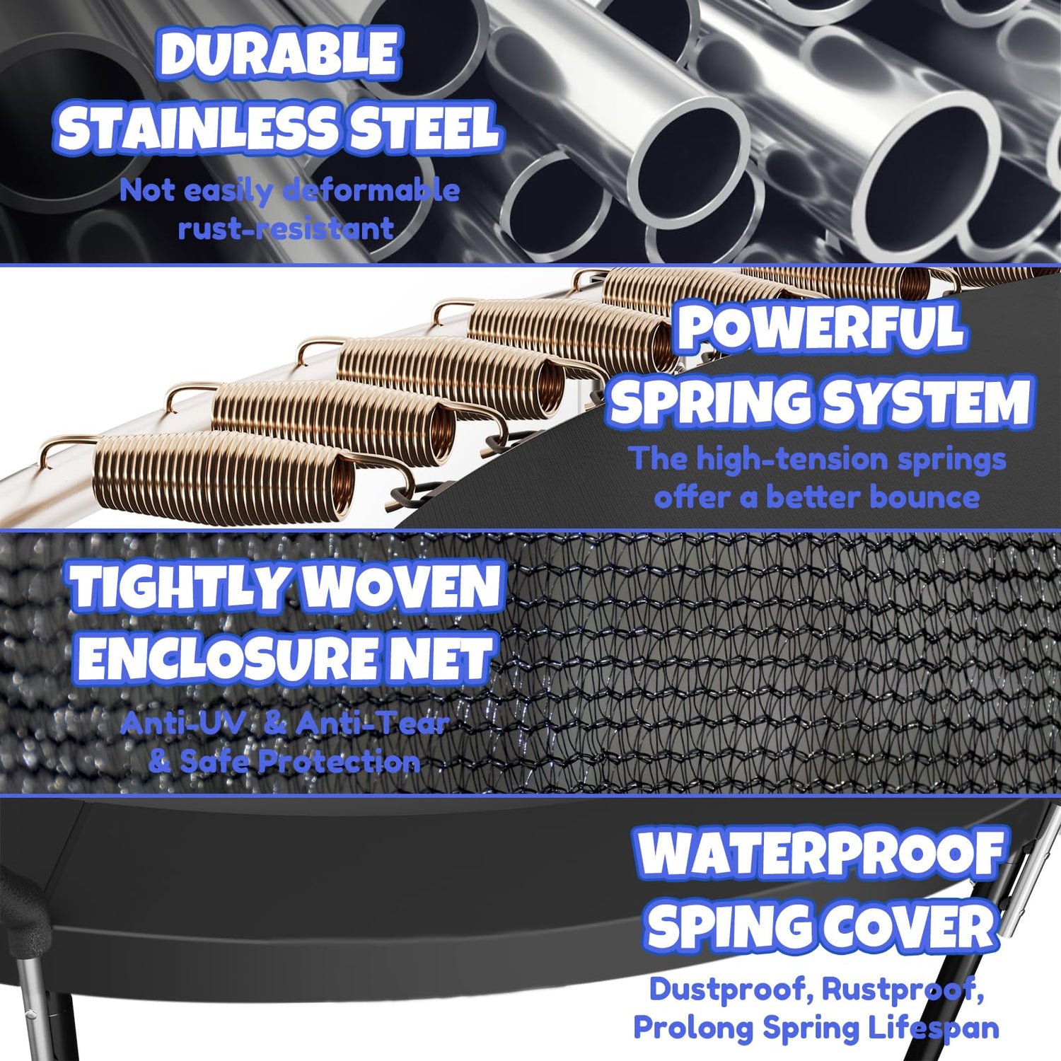 - 【Safety is Our Top Priority】Safety comes first with our ASTM-certified backyard trampolines, which feature curved poles that ensure a safe 16.5-inch distance from the enclosure net to avoid collisions while jumping.