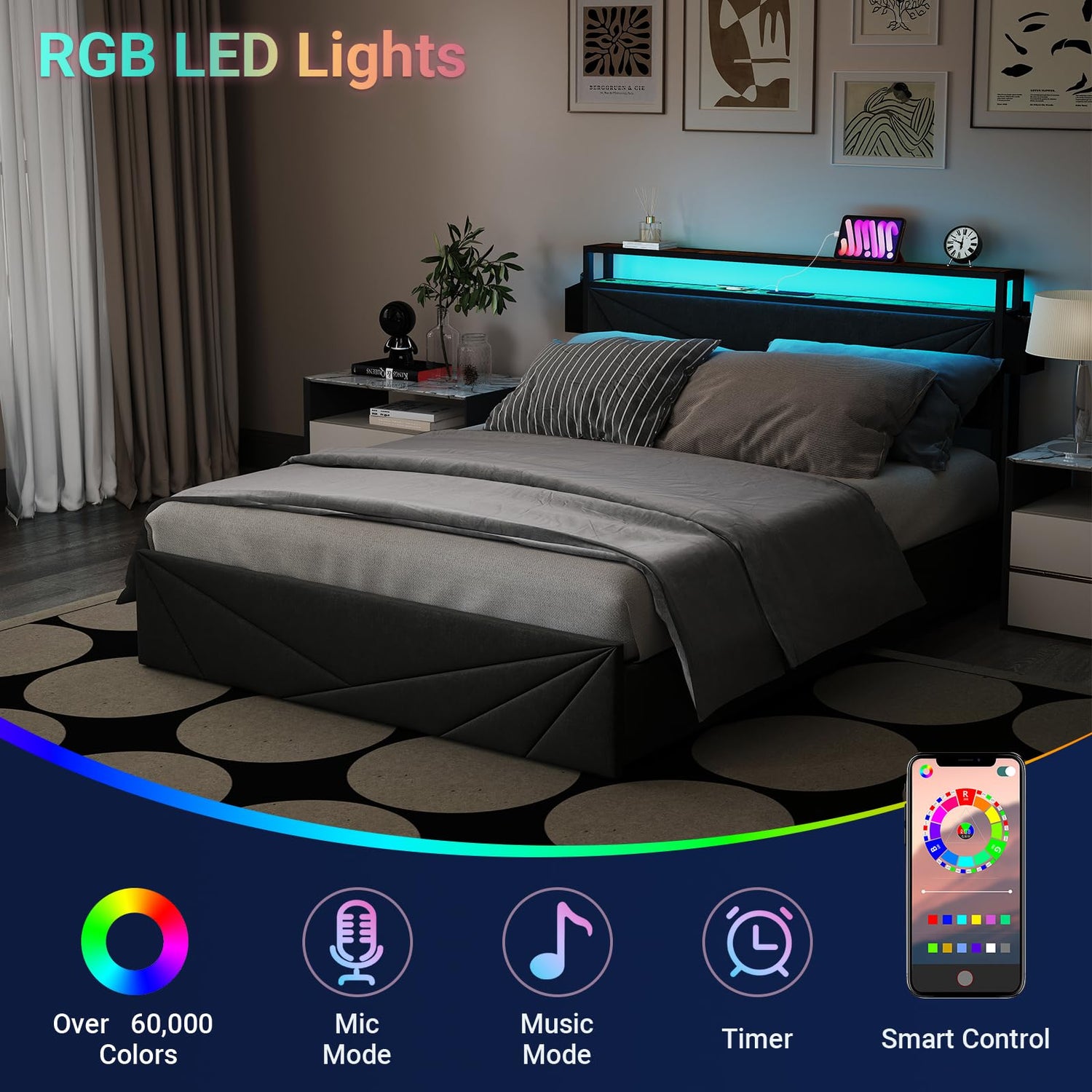 - 【Intelligent RGB LED Lighting】Customize your ambiance with LED lights on the headboard, controllable via app, led full bed frame offering over 60,000 color options.