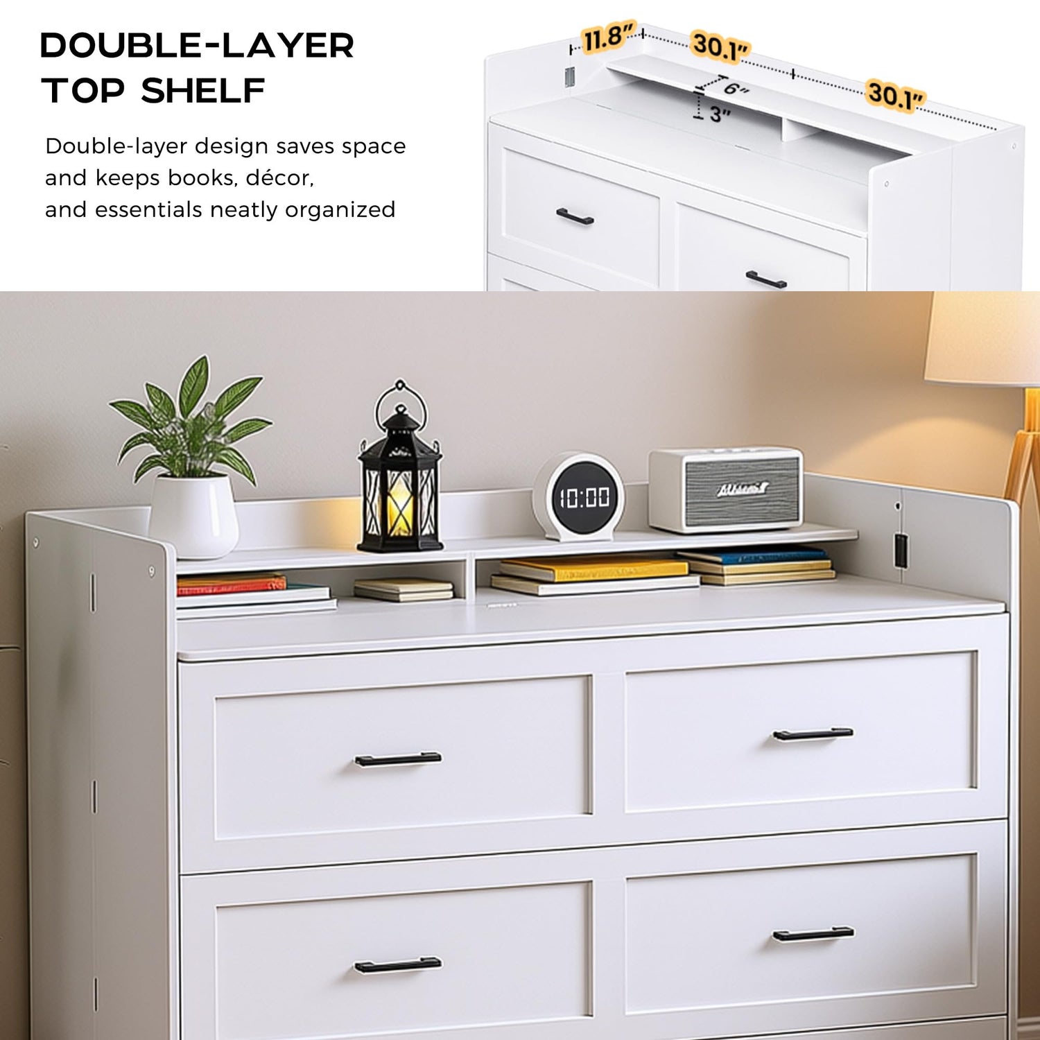 - 【Spacious Storage】 Two large drawers provide ample space for bedding, pillows, or seasonal clothing. A double-layer storage shelf at the top keeps essentials within easy reach. A hidden compartment inside the cabinet is designed to store a foldable bed frame (mattress not included).