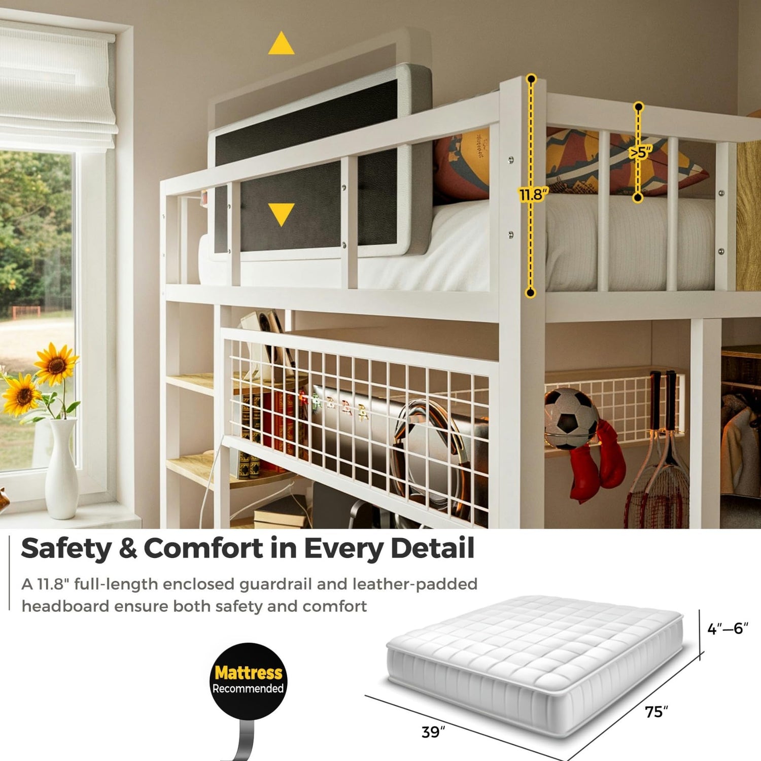 - 【Safe Loft Bed with Stairs and Headboard】 Designed with sturdy engineered wood and metal frame, this twin loft bed includes step-style stairs for secure climbing. And a sleek faux leather headboard for added comfort. Full-length guardrail and multiple anti-tipping devices ensure maximum stability and safety.
