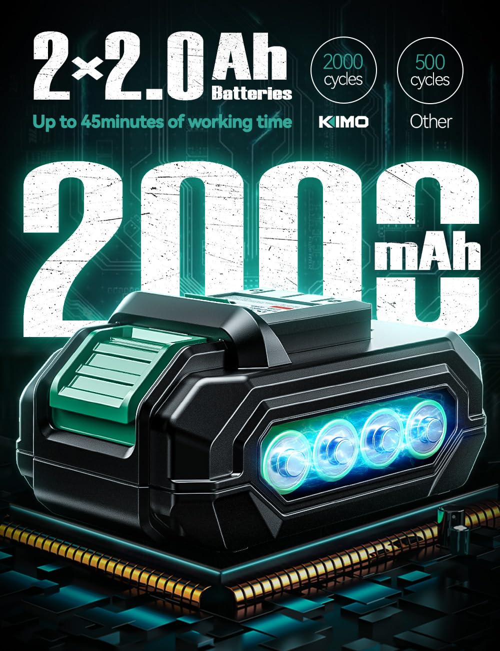 KIMO Battery System Serves You! The variety of KIMO power tools sharing the same battery platform is peerless and will surprise your impressively. KIMO takes pride in its batteries. Every single KIMO Lithium-Ion Battery is expected to be charged at least 1000 cycles. .