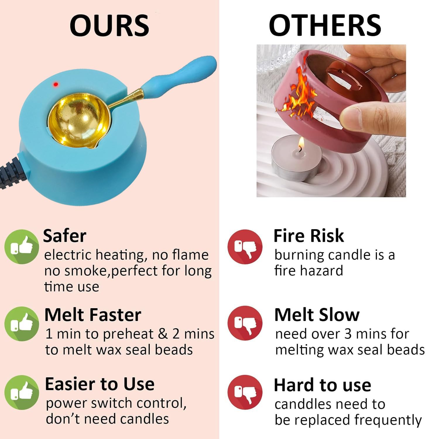 • 【Melting Faster】Press the switch button, put in the wax beads, wait for 3 minutes to use. Unique electric wax melting furnace, more bigger and deeper spoons can melt more at once, no waste and easy to clean.