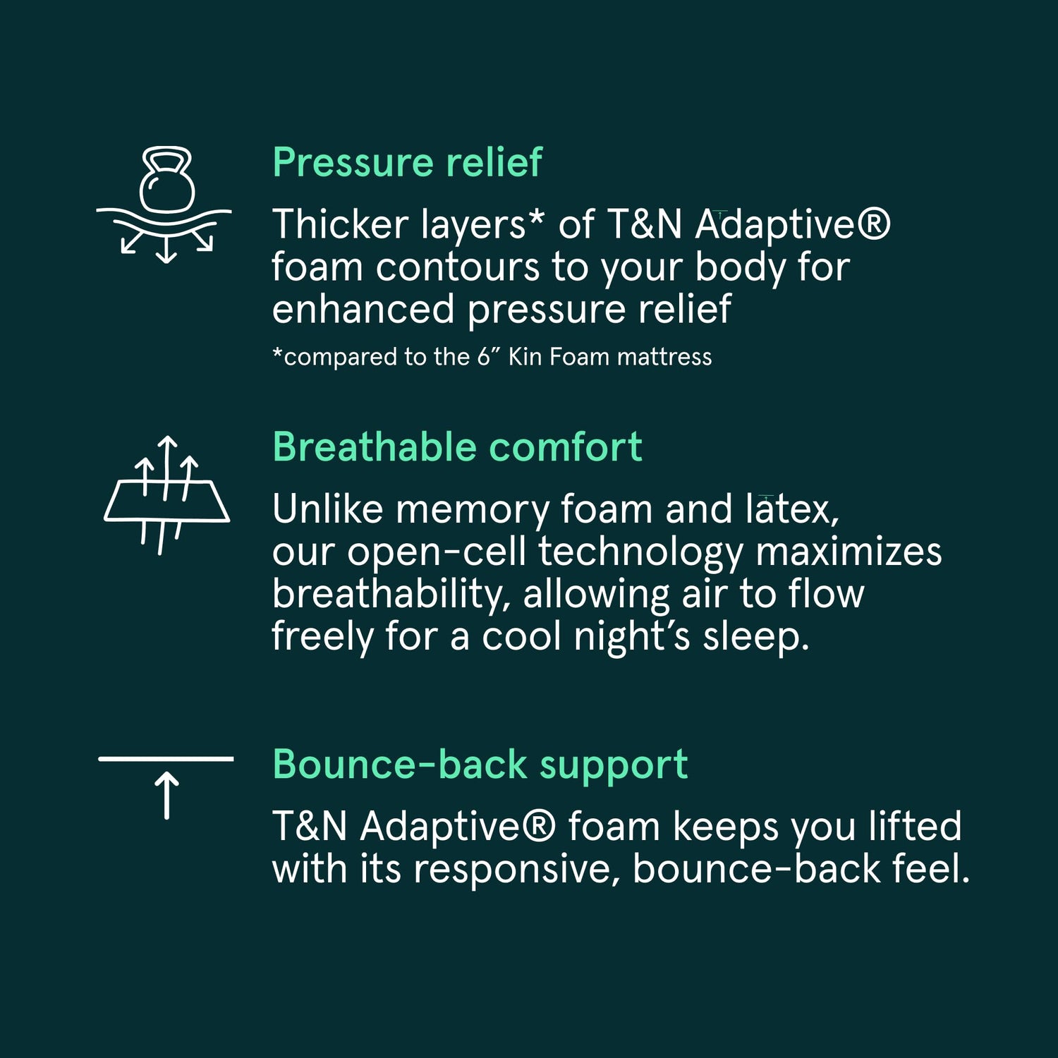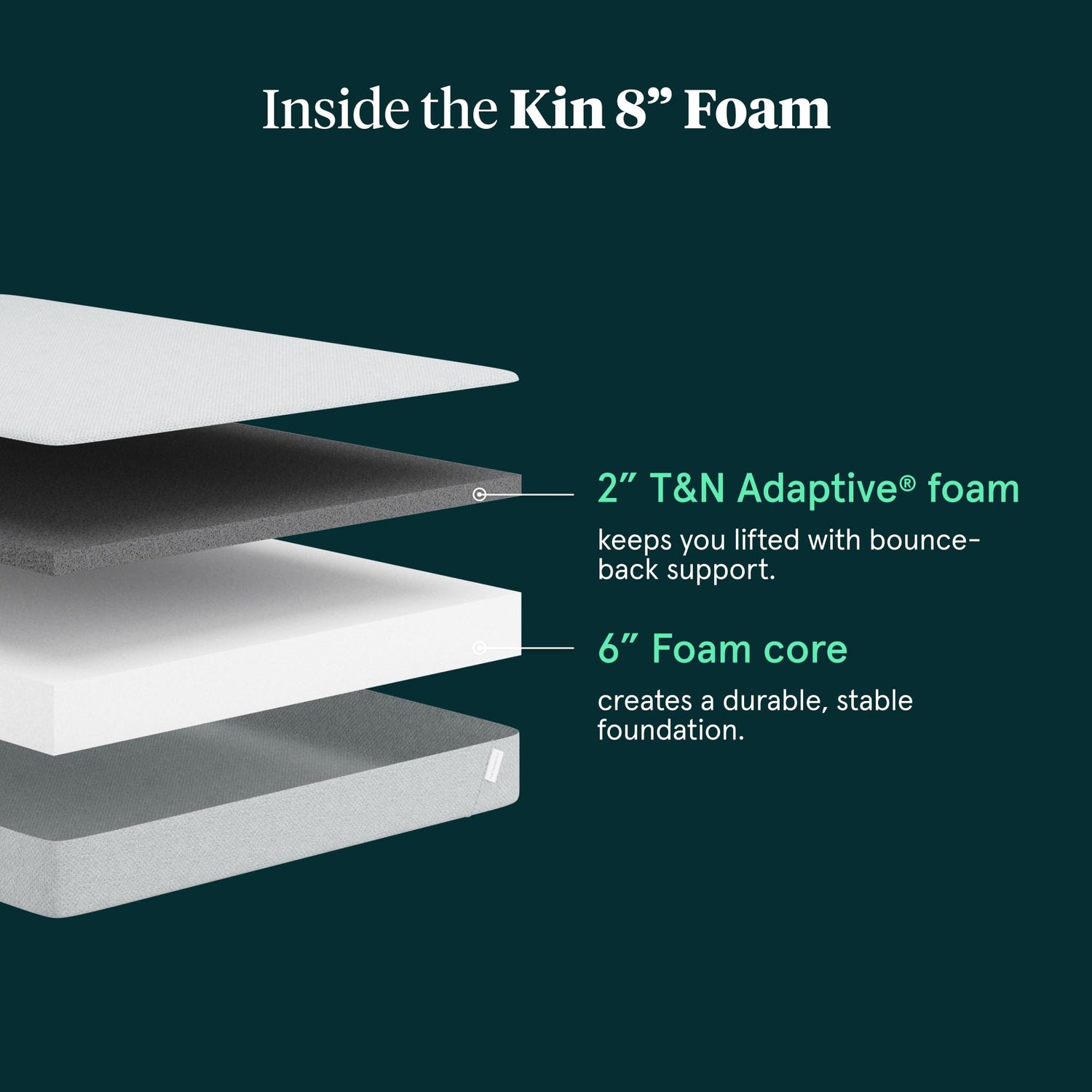 Details: Discover the benefits of Tuft & Needle for less with the Tuft & Needle Kin 8 inch Firm Foam mattress. Exclusive to Amazon for the best savings, this mattress offers innovative cooling, responsive pressure relief, and a bounce-back feel, so you sink deep into sleep—but never into your mattress. Rest well as our T&N Adaptive foam's bounce-back design keeps you lifted while contouring to your body to relieve pressure. Thicker layers* of T&N Adaptive foam help provide additional comfort. Plus, a Foam Core for durable support, and GreendGuard Gold and CertiPUR-US certified foams for better indoor air quality, help you rest easy. Available in Twin, Twin XL, Full, Queen, King, and Cal King sizes, the Amazon-exclusive Tuft & Needle Kin 8” Foam mattress offers you the quality and comfort you need to wake up awake for years to come. *Compared to the 6” Kin Foam mattress.