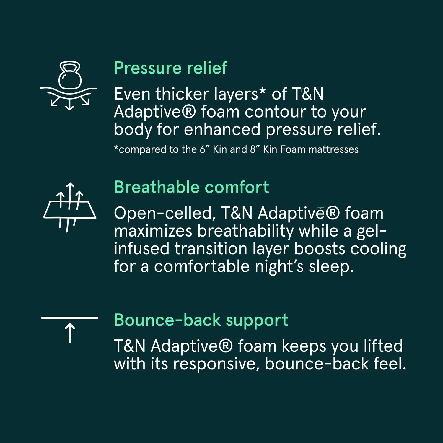 - Breathability and Bounce-Back support — our open-celled T&N Adaptive foam maximizes breathability, support, and pressure relief. T&N Adaptive foam is designed to feel more supportive than memory foam and latex and help you sleep cooler all night