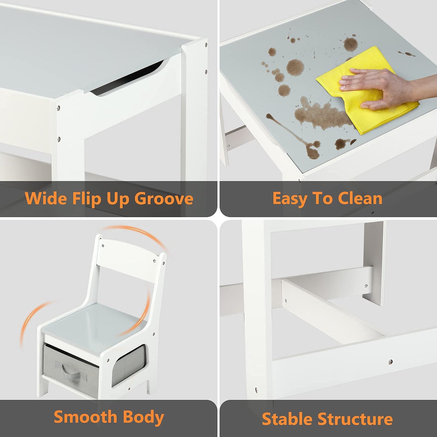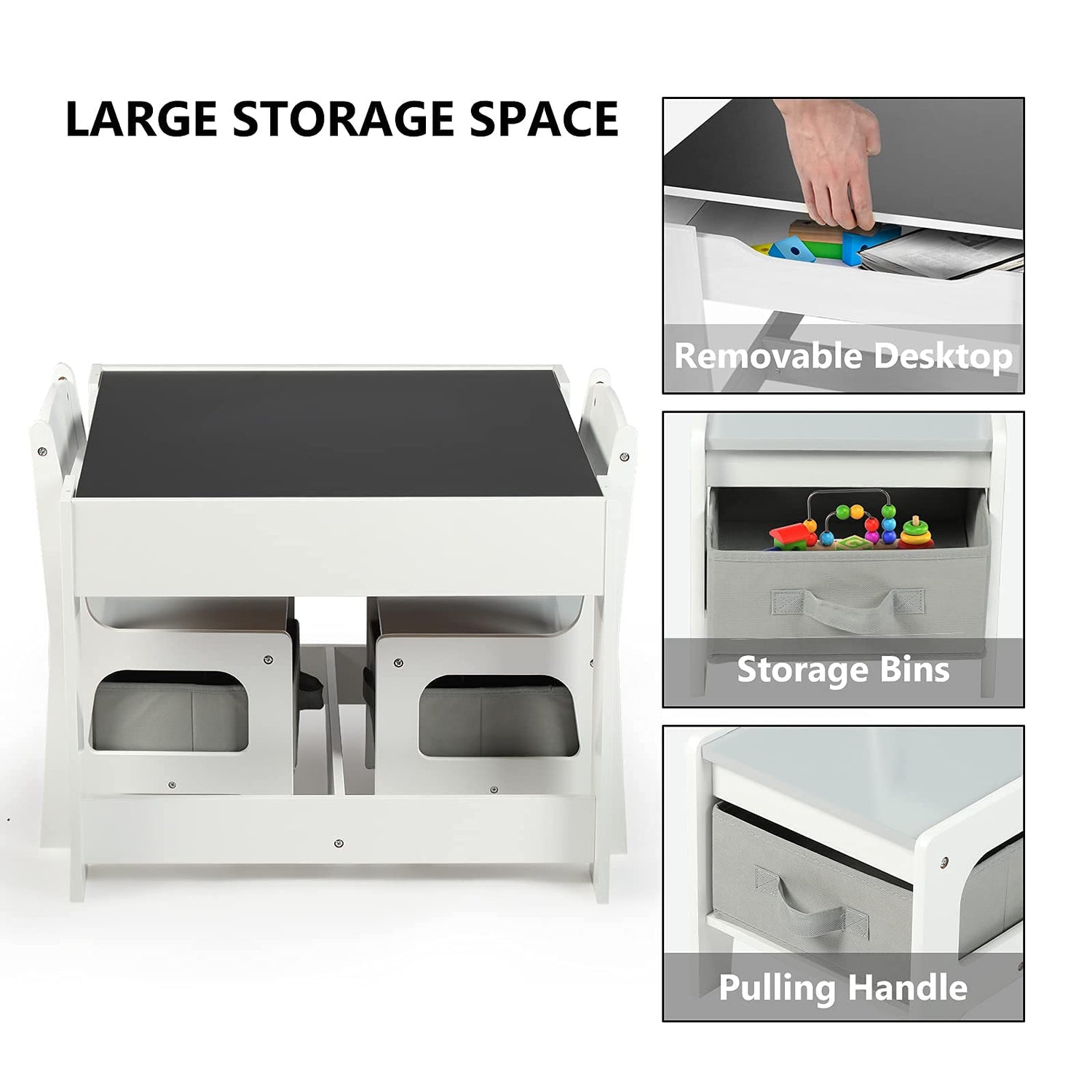 Kinder King Kids Wood Table & 2 Chairs Set, 3 in 1 Children Activity Table w/Storage, Removable Tabletop, Blackboard, 3-Piece Toddler Furniture Set for Art, Crafts, Drawing, Reading, Playroom, Grey