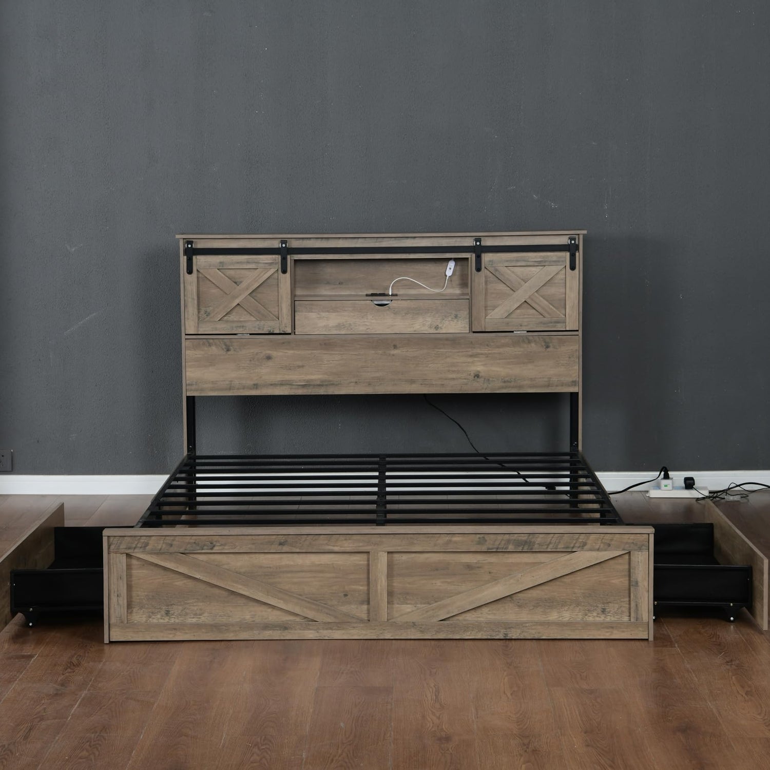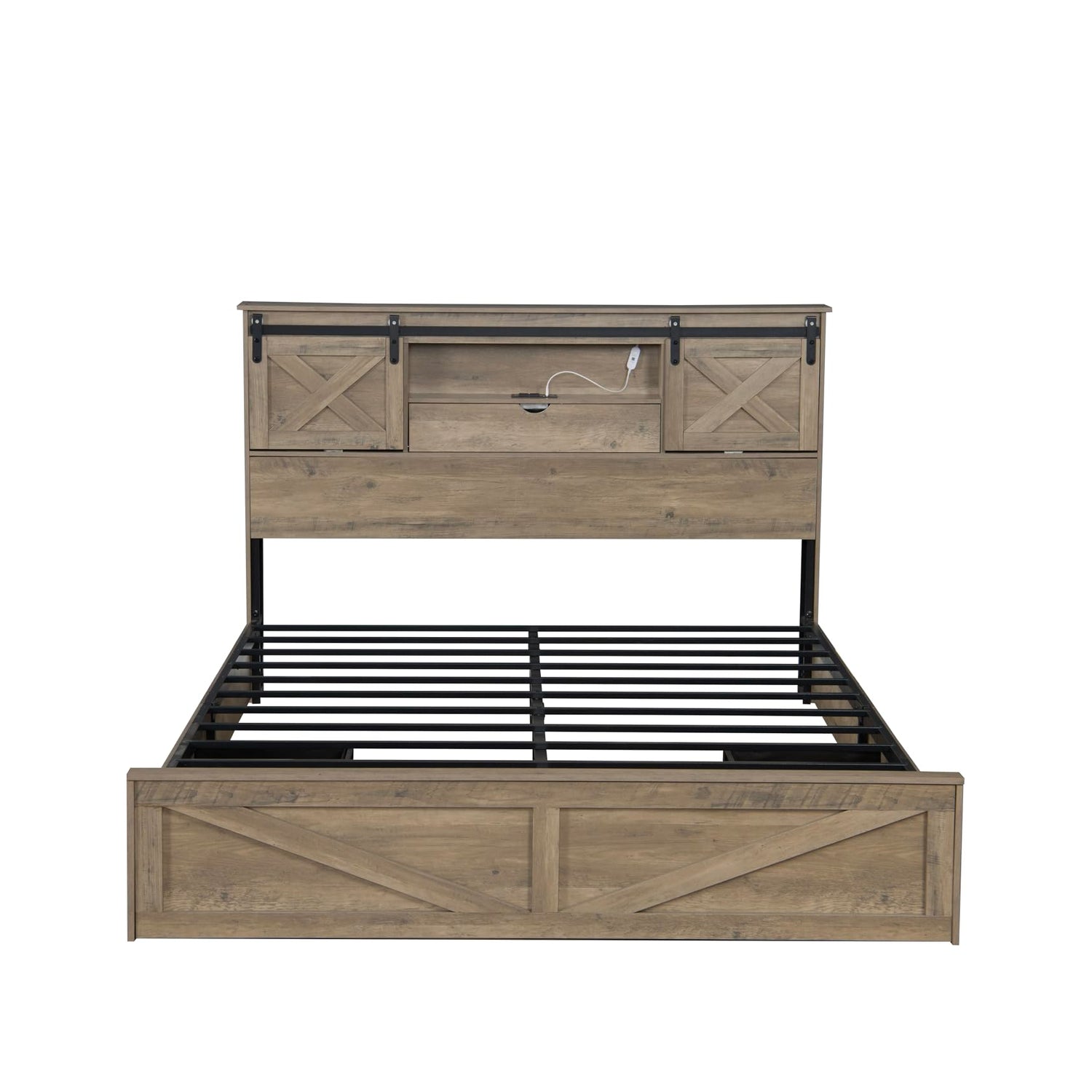 Details: Farmhouse Queen Bed Frame with Storage & Tech