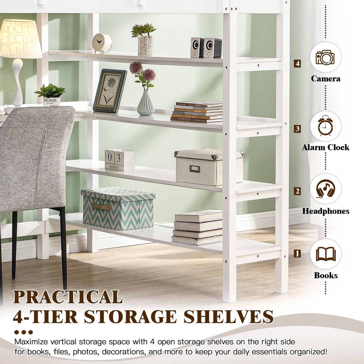 KINFFICT Loft Bed Full Size with Desk and Shelves, Heavy Duty Full Loft Bed Frame with Bookcase Storage, Solid Wood Lofted Bed Frame, Space-Saving, Noise Free, No Box Spring Needed