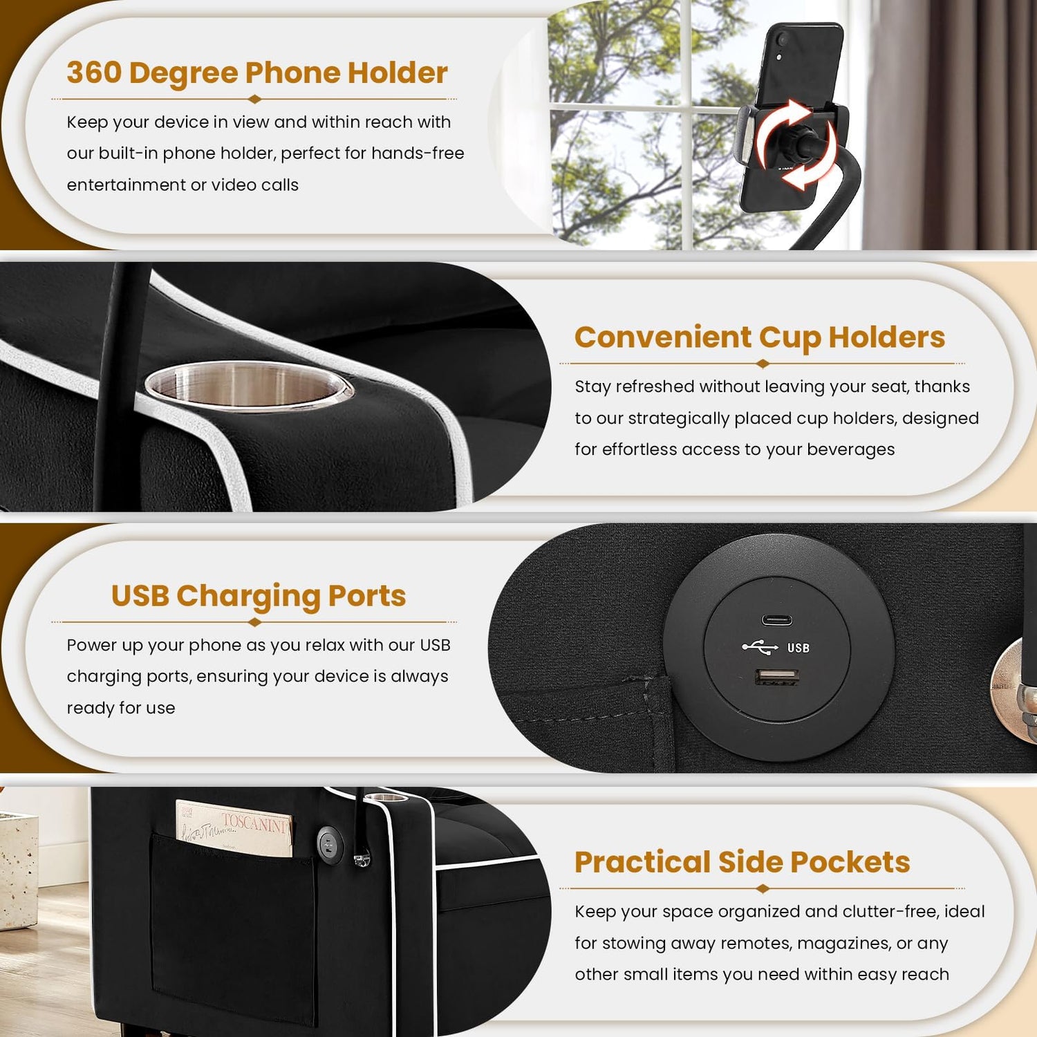 - Upgraded Dual-port Charging & Phone Holder: The 3 in 1 sofa bed is compatible with two different port devices, USB and type C, keeping your phone fully charged all the time. The 360°rotating and adjustable phone holder helps you watch movies or make video calls with your hands free. Moreover, the cup holders on the armrests are convenient for placing drinks and water, so you no longer have to worry about missing the highlights of the movie