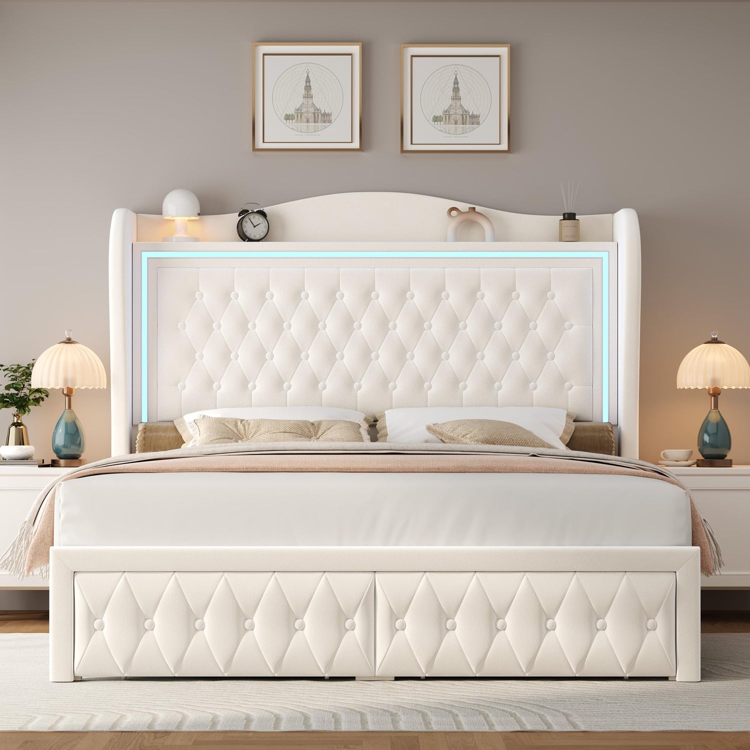 Keyluv 55" Tall Velvet Upholstered King Bed Frame with LED Lights and 2 Storage Drawers