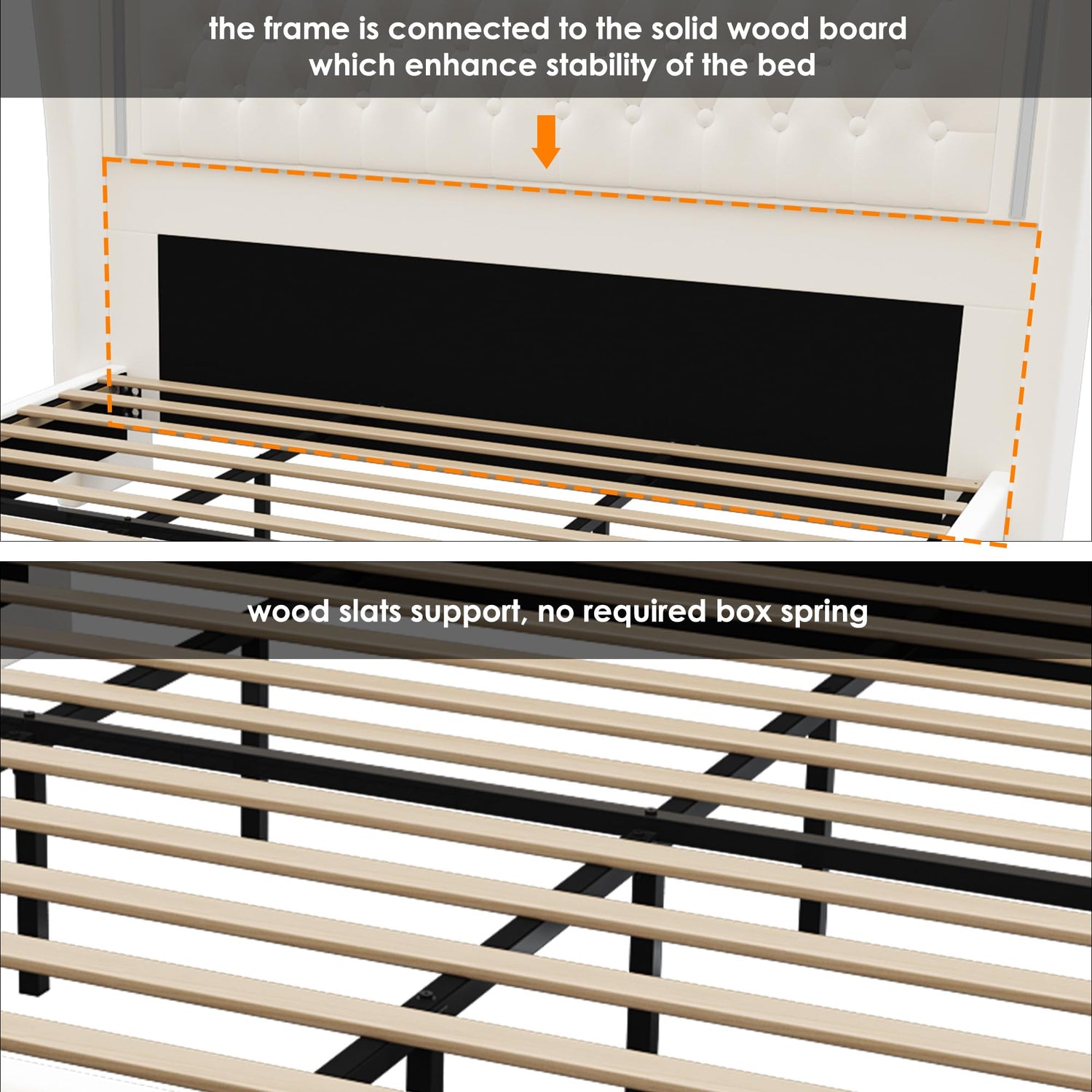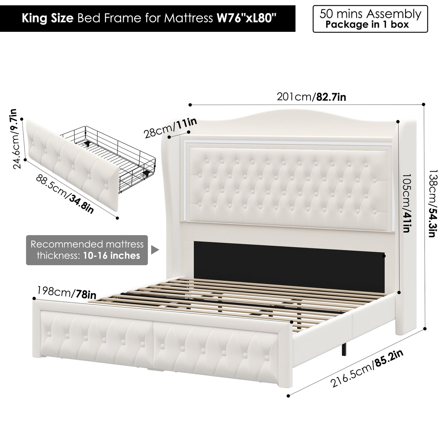 The standout feature of this bed is its 55-inch tall headboard, upholstered in soft velvet fabric that adds both comfort and elegance. It provides a perfect resting space for your back, allowing you to relax in style. It's recommended to pair it with a mattress thickness of 10-16 inches or, for those who prefer extra height, you can also use a mattress in conjunction with a box spring.