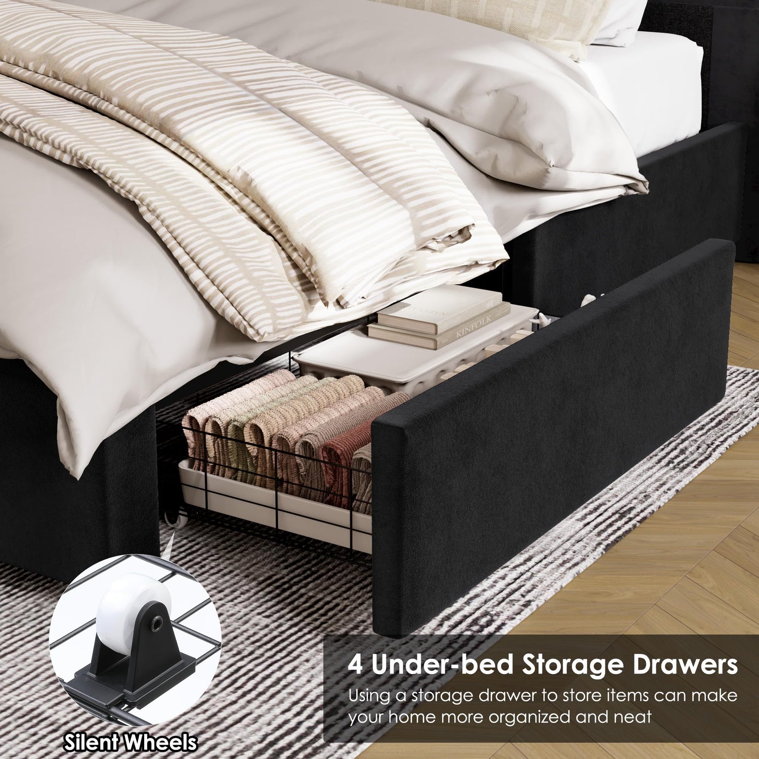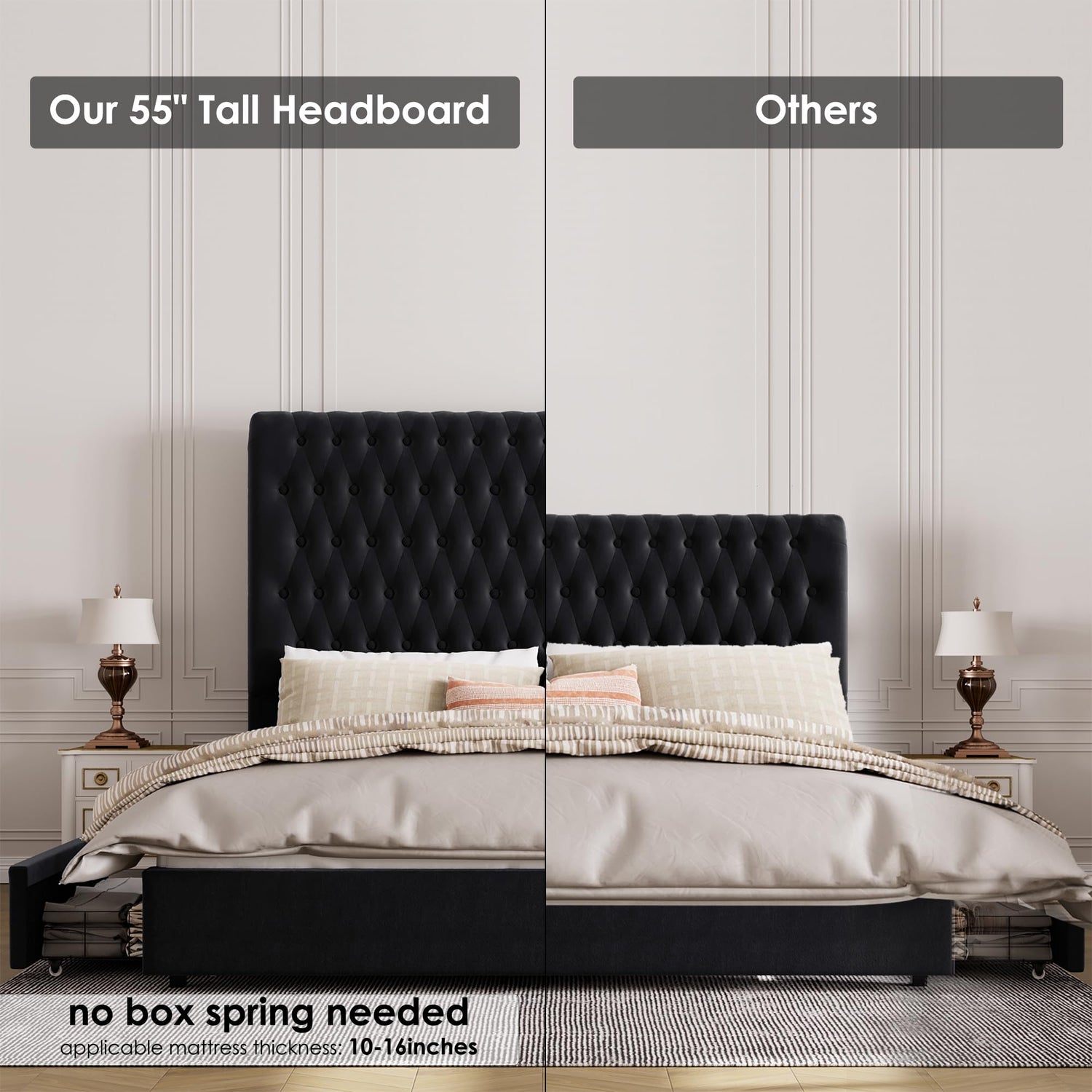 King Size Bed Frame 55" Tall Headboard with Gorgeous Button Tufted and Nail, Velvet Fabric Upholstered Bed Frame includes 4 Under-bed Storage Drawers, Wooden Slats, Noise-Free, Easy Assembly, Black