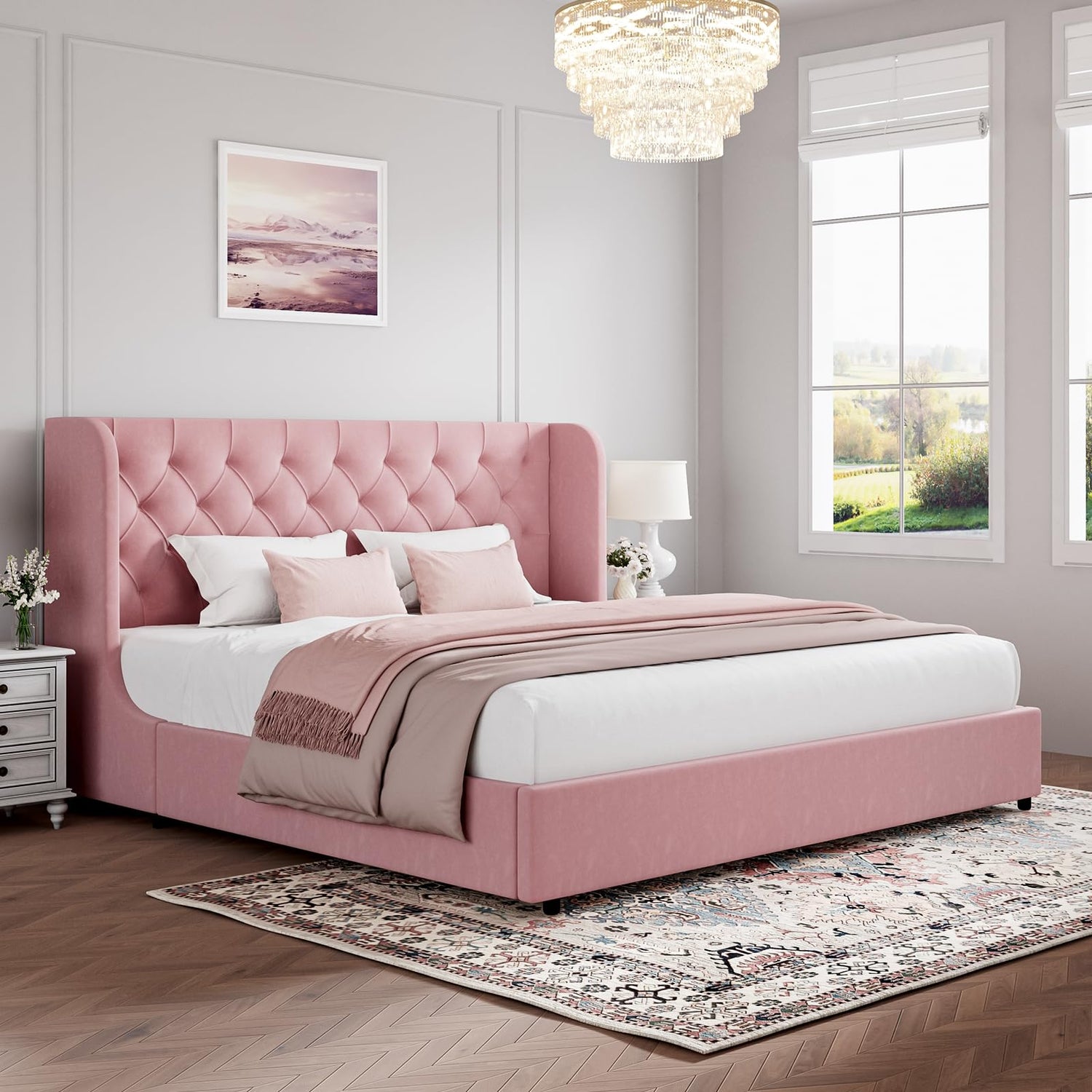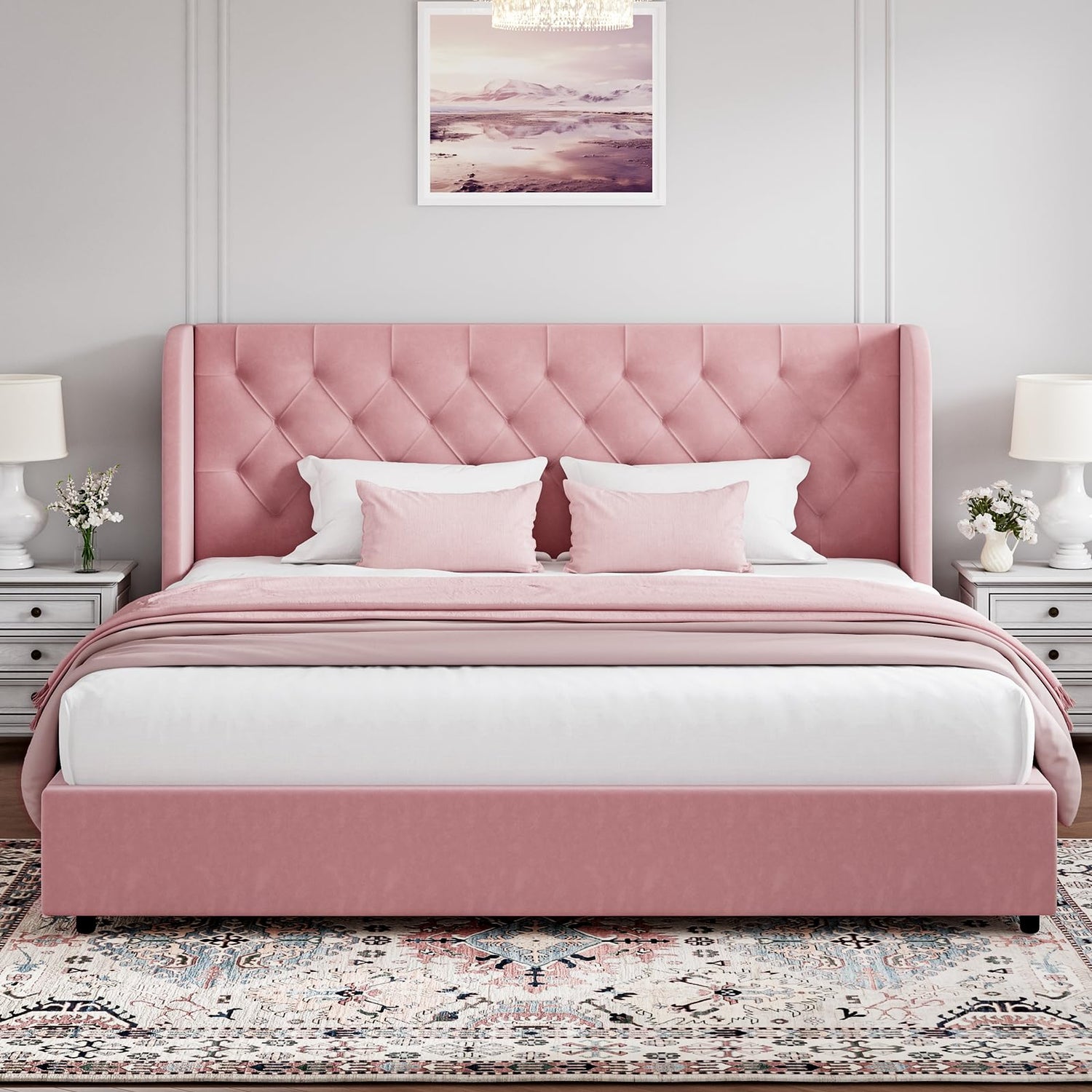 King Size Bed Frame, Pink Upholstered Bed Frame King with Wide Wingback, Softly Curved Wings Velvet Headboard, Sturdy Wooden Slats Support, No Box Spring Required, Noise Free, Easy Assembly, Pink
