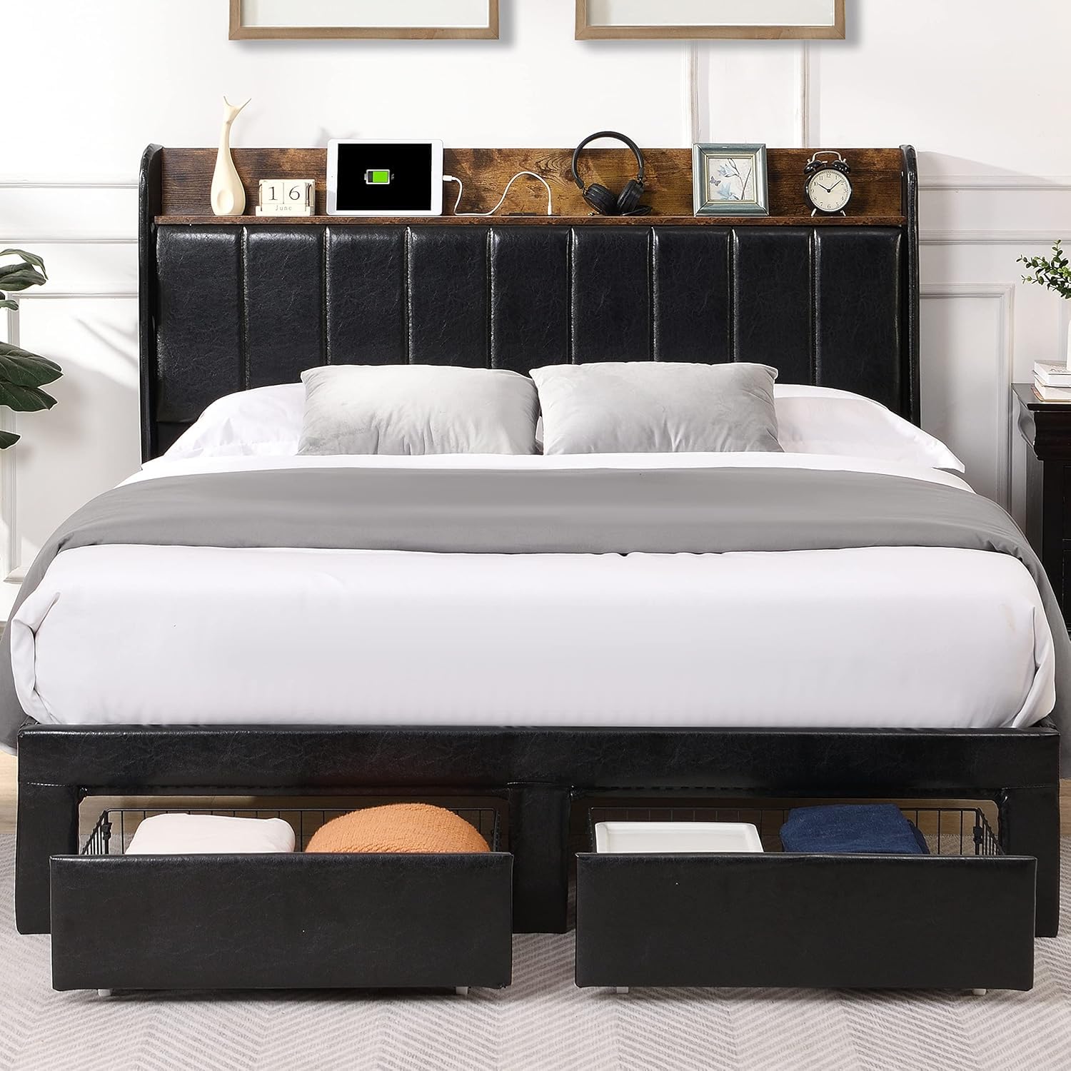 King Size Bed Frame with Headboard, Upholstered Platform Bed Frame with Charging Station & 2 Storage Drawers, Sturdy Wooden Slats Support, No Box Spring Needed, Easy Assembly, Noise Free, Black