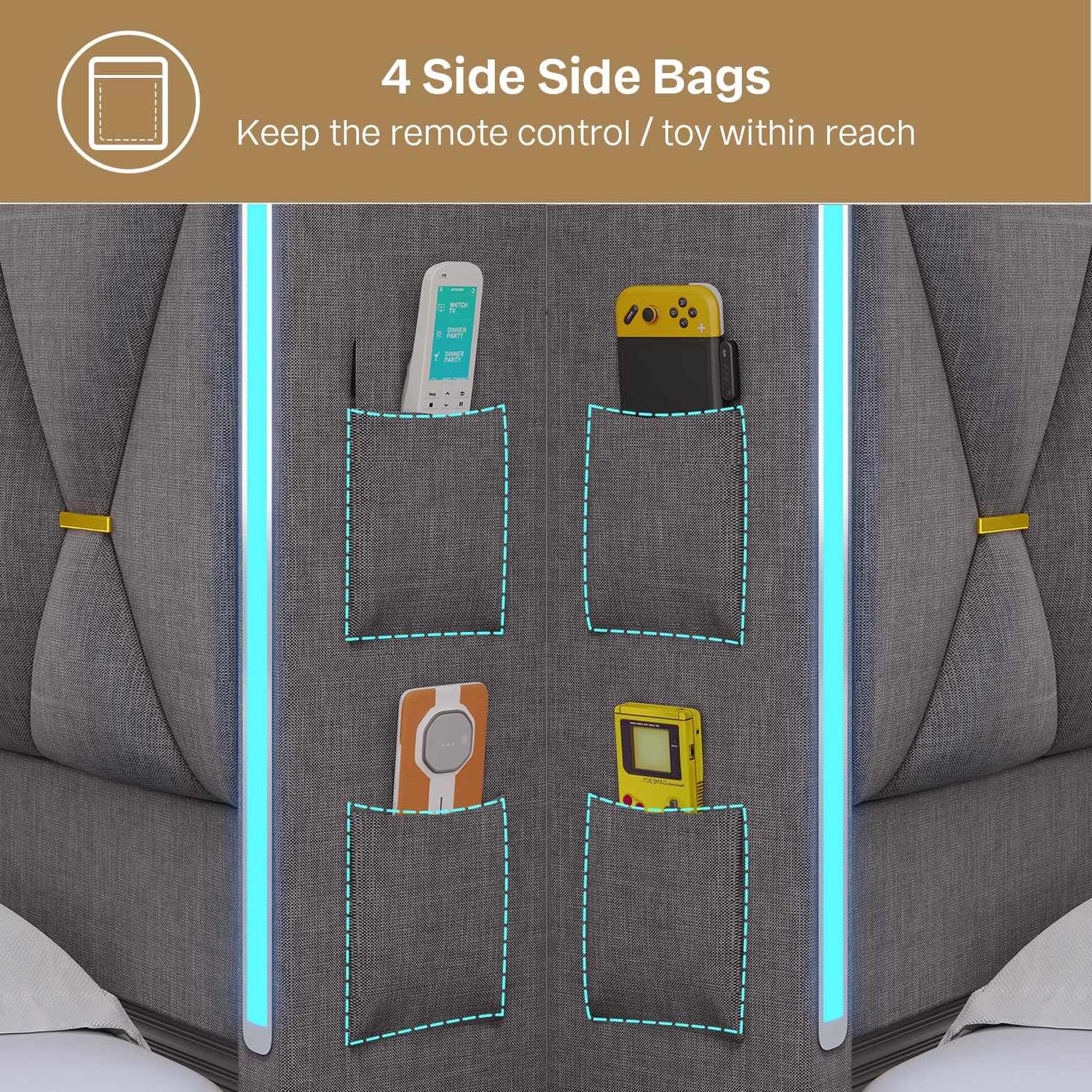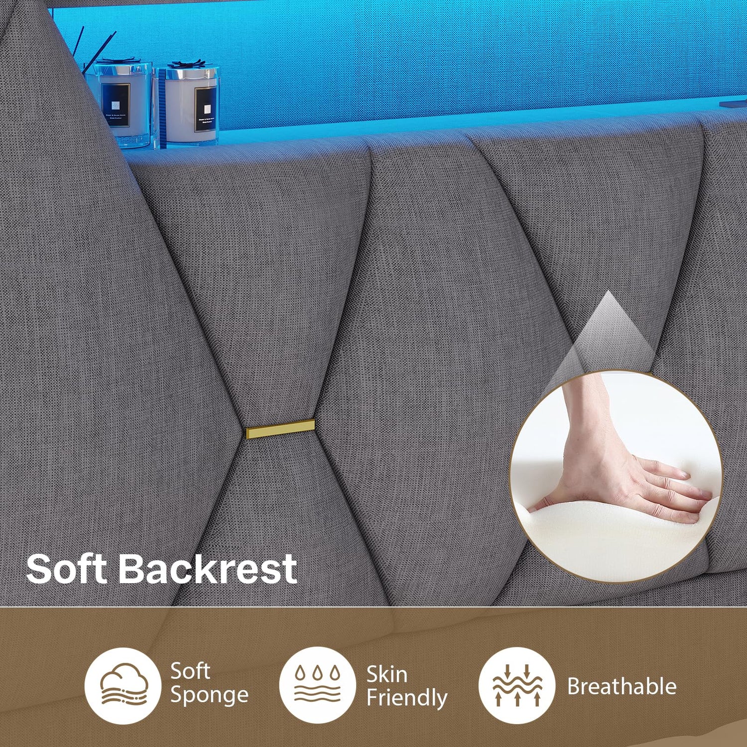- 【Smart RGB LED Lights】King size bed frame and headboard have multifunctional LED lights strips,bed frame king have over 60000 colors to choose from, Mobile App +Remote Control multiple control modes. King bed frame with storage can freely set the brightness, color, mode and timing functions to create various scenes.