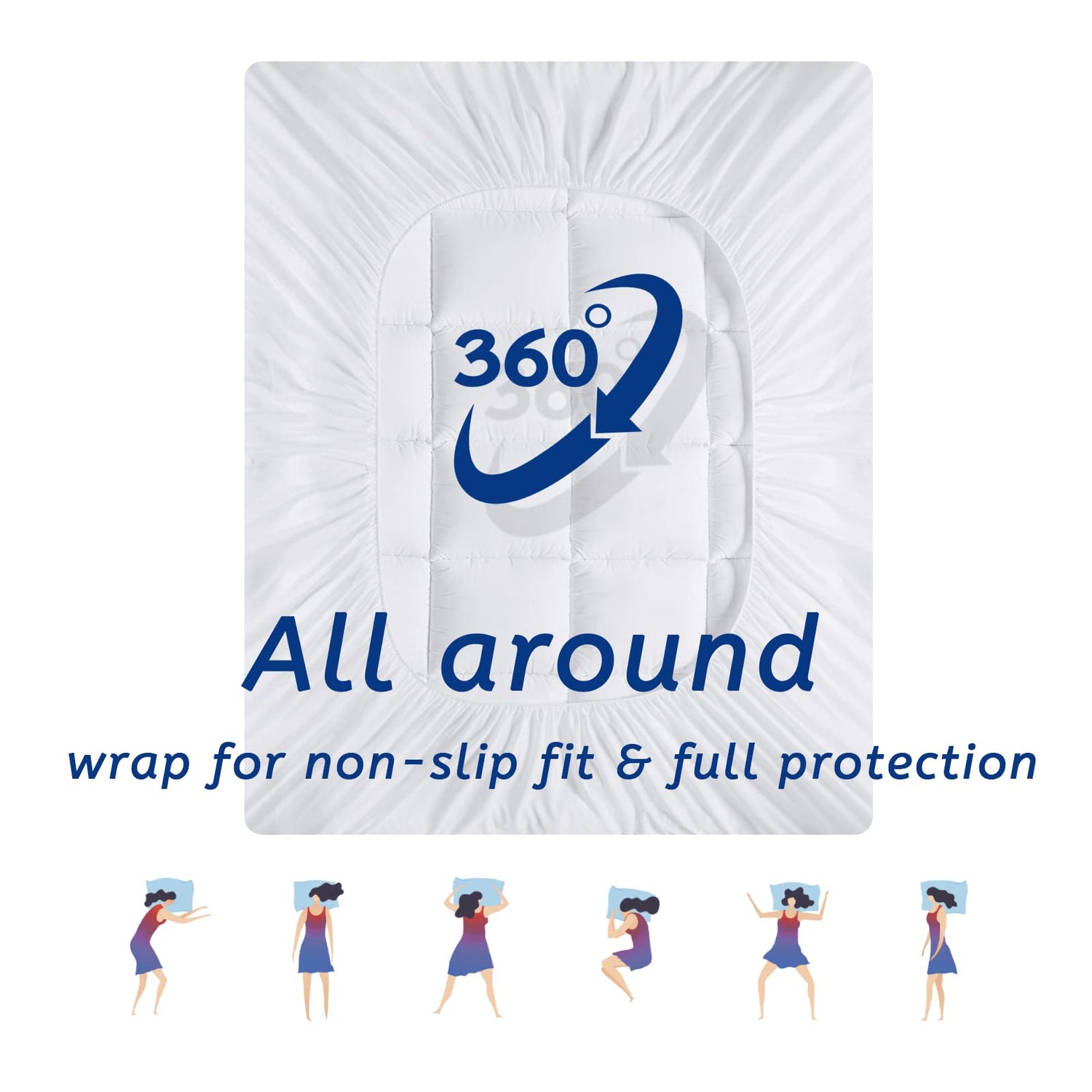 - Deep Pocket & No-Slip: The 8"-21" elastic deep pocket wraps your mattress 360° all-around, ensuring a secure fit. Thanks to the no-slip back design, the pillow top stays in place, allowing you to toss and turn freely during those sleepy nights. Enjoy uninterrupted sleep without any worries.