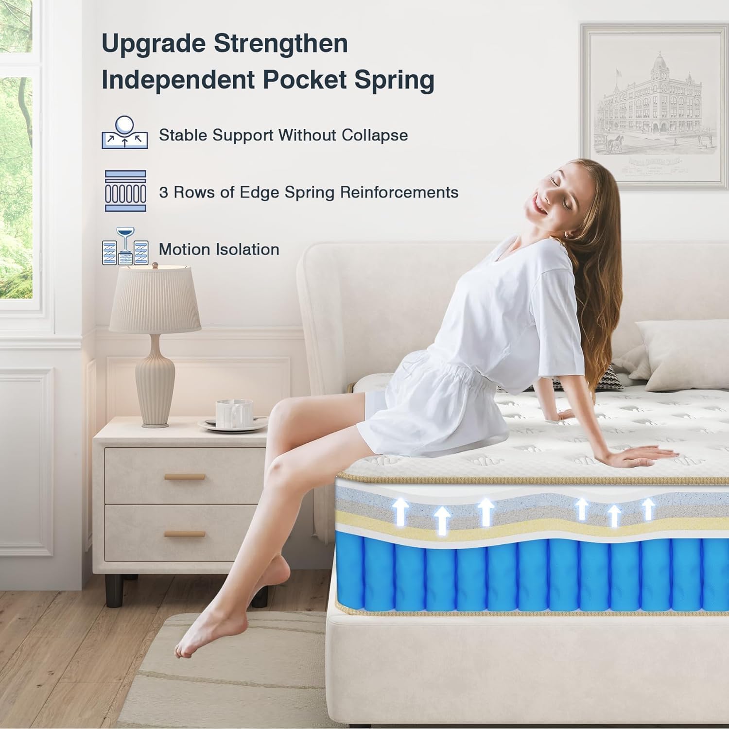 - Stronger Edge Support: The King size mattress is formed with hundreds of upgrades enhanced Independent Pocket Springs to provide targeted and stable support according to the curve of the body, and prevent you from sliding off the edge of the mattress, effectively blocking the noise of your partner's movement, providing you with superior support and quiet deep sleep